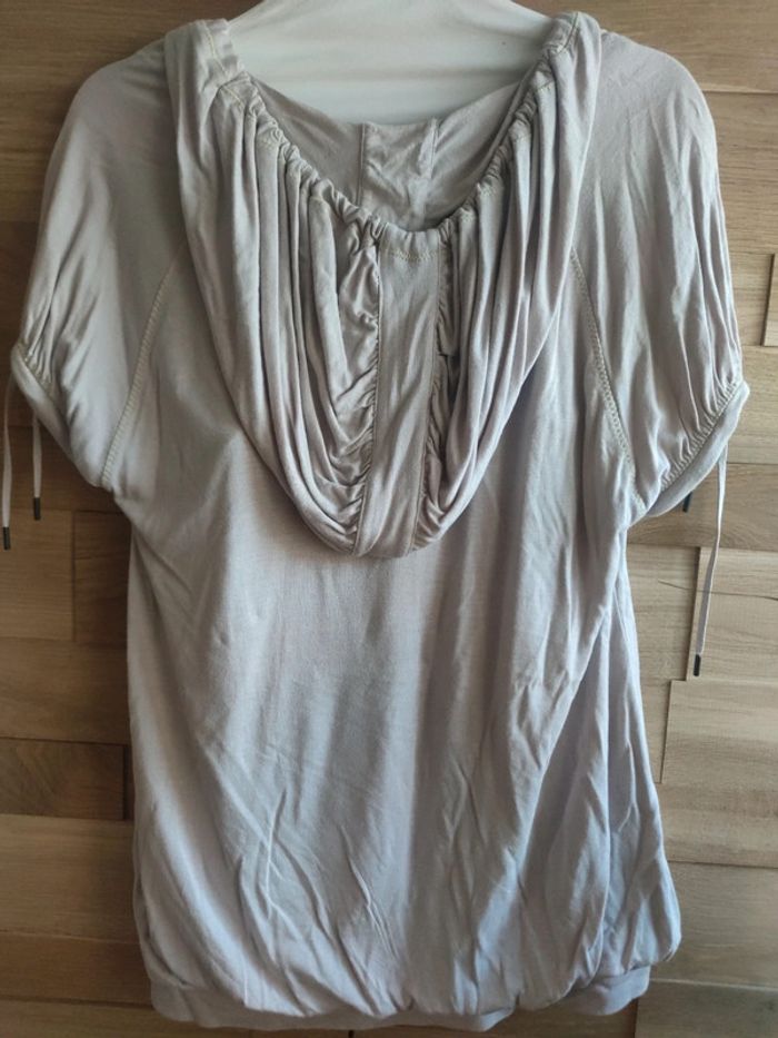 T-shirt Manches courtes, avec capuche, kaki, rose~parme clair, avec une pointe de jaune et vert anis, liens de serrage devant et sur les bras, cousu l'un et l'autre, style débardeur et T-shirt ample T.xl / LE COQ SPORTIF Très bon état #JLA42