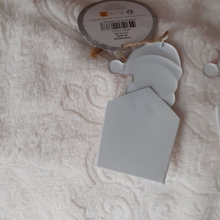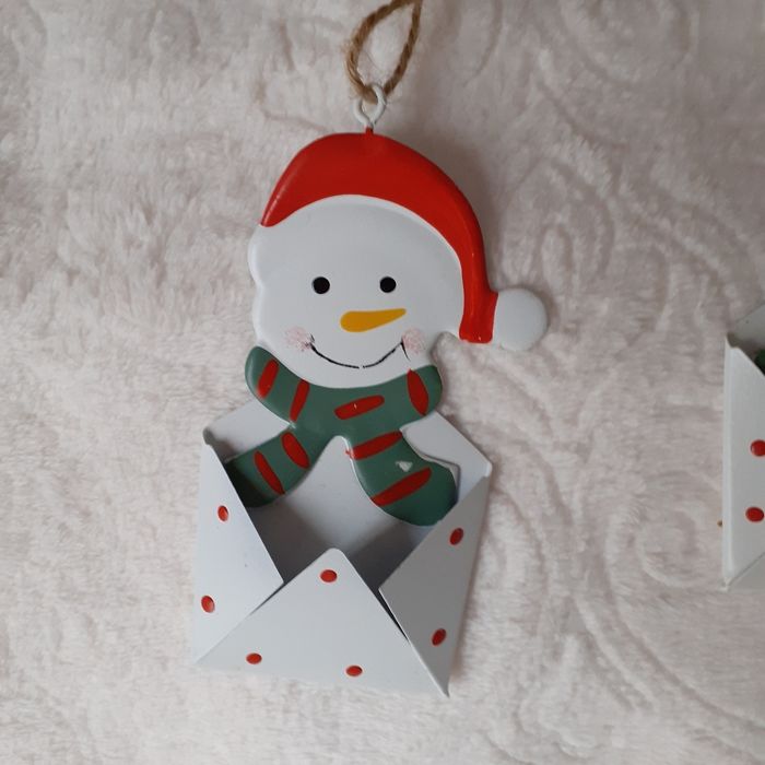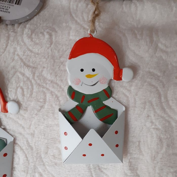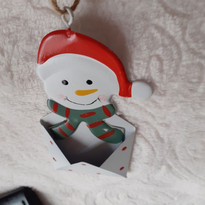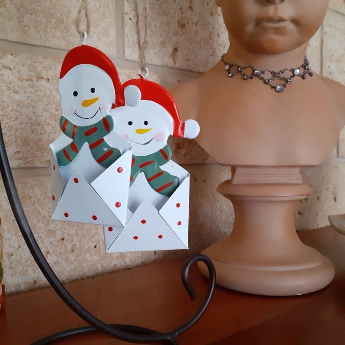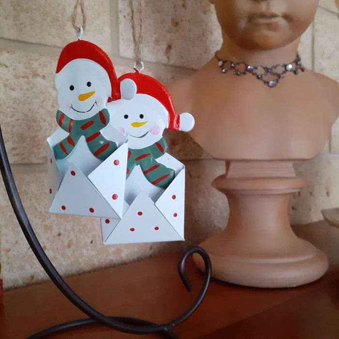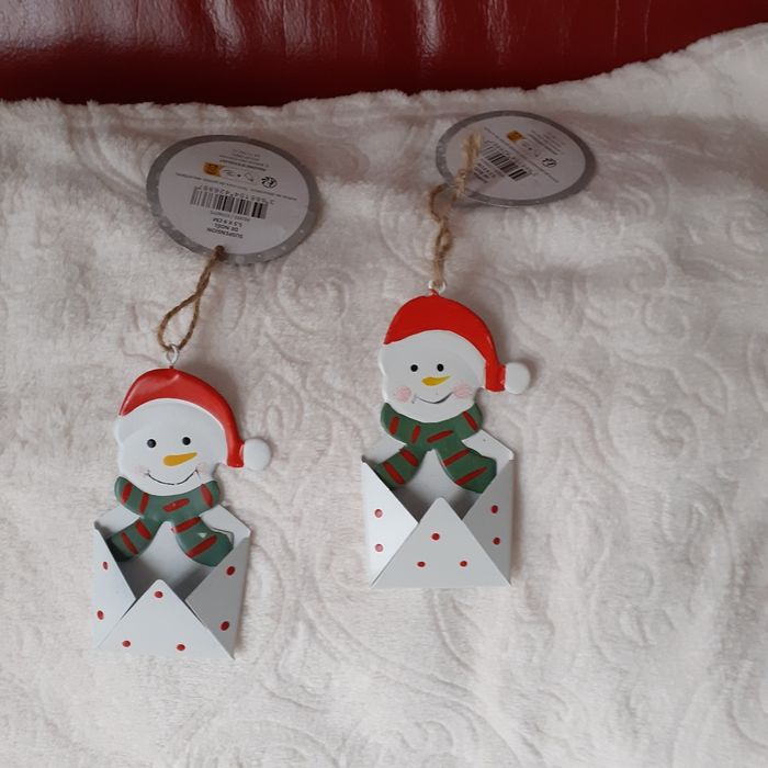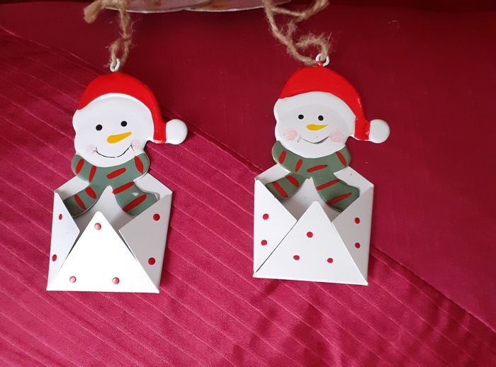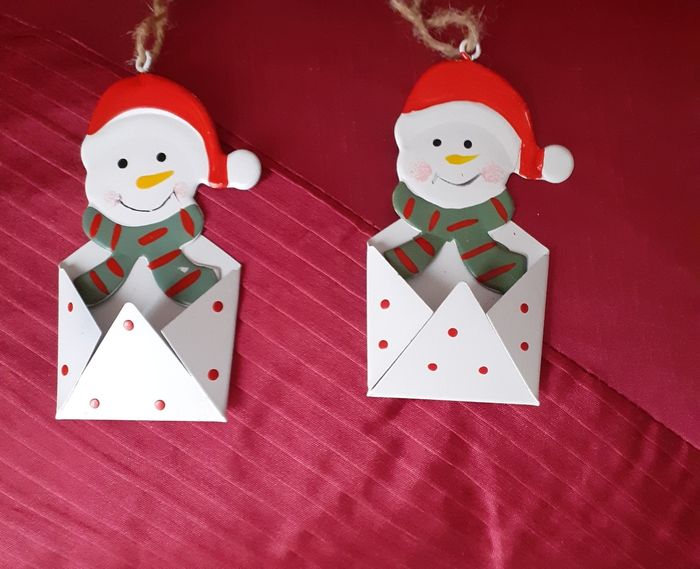 Articles neufs,encore étiquetés. Lot 2 Bonhommes de neige IDENTIQUES métal peint; permettant d'insérer devant une étiquette nominative. Ficelles de suspension ( peut être suspendu ds le sapin ou sur 1 paquet cadeau) // voir photos pour détails
