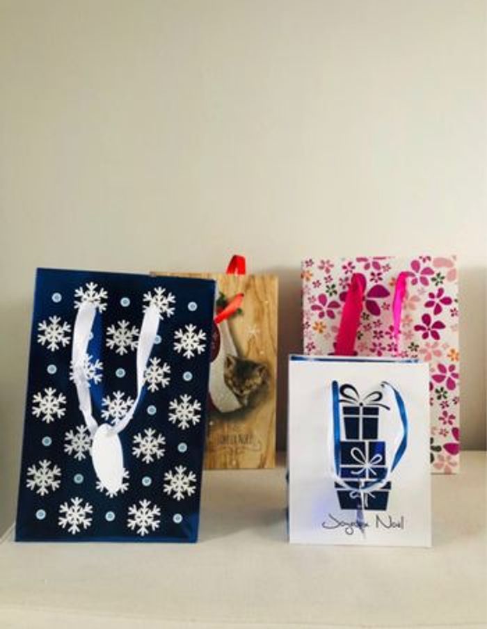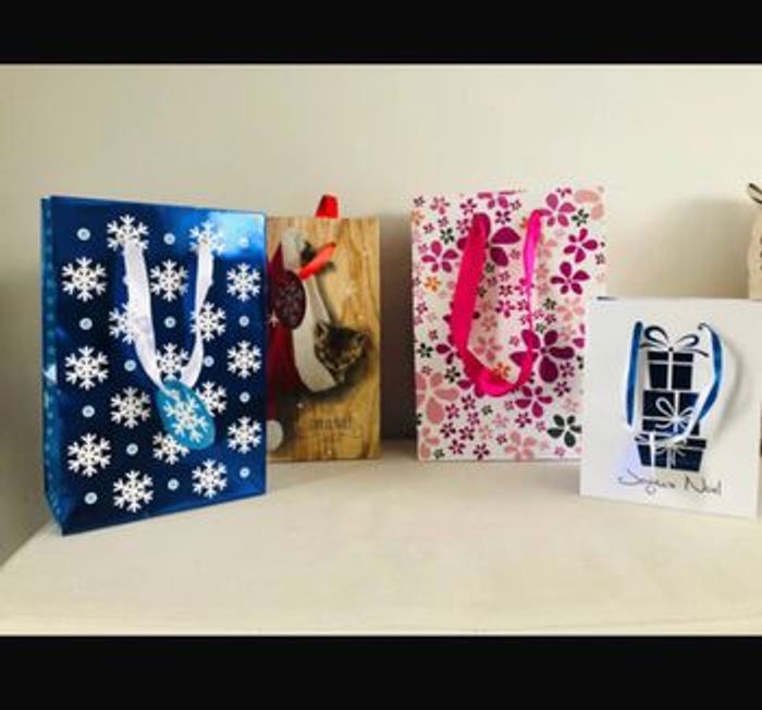 Achat aujourd’hui ? 👉🏻 Départ du 📦 demain ! Lot de 4 sacs cadeaux cartonnés pour Noël Différentes tailles, modèles et marques. État : neuf jamais servis Mot clé: flocon bleu noël rouge chat joyeux noël fleurs