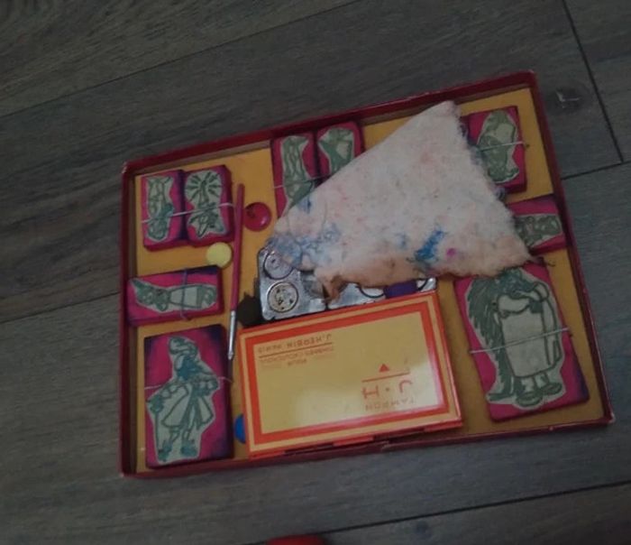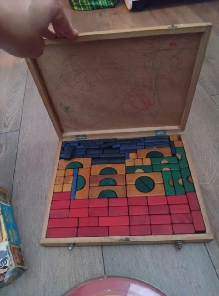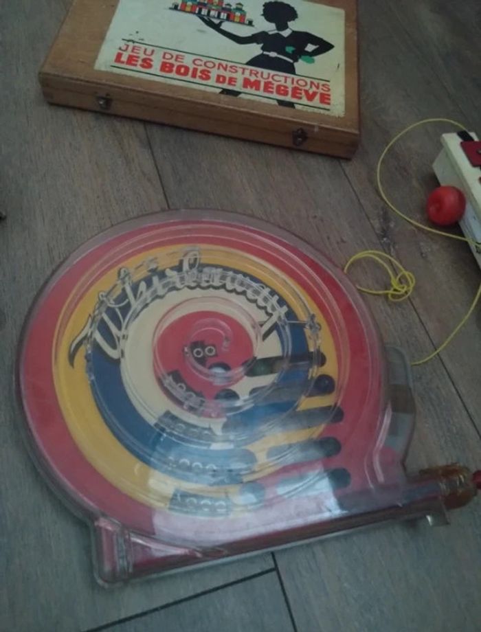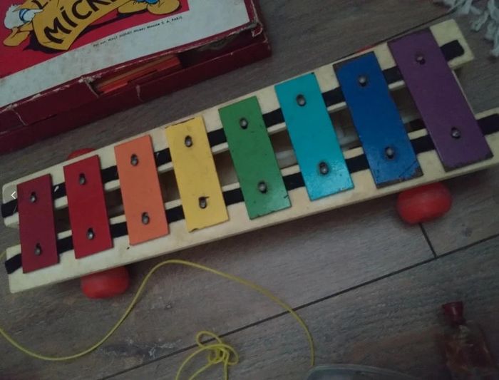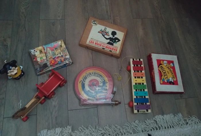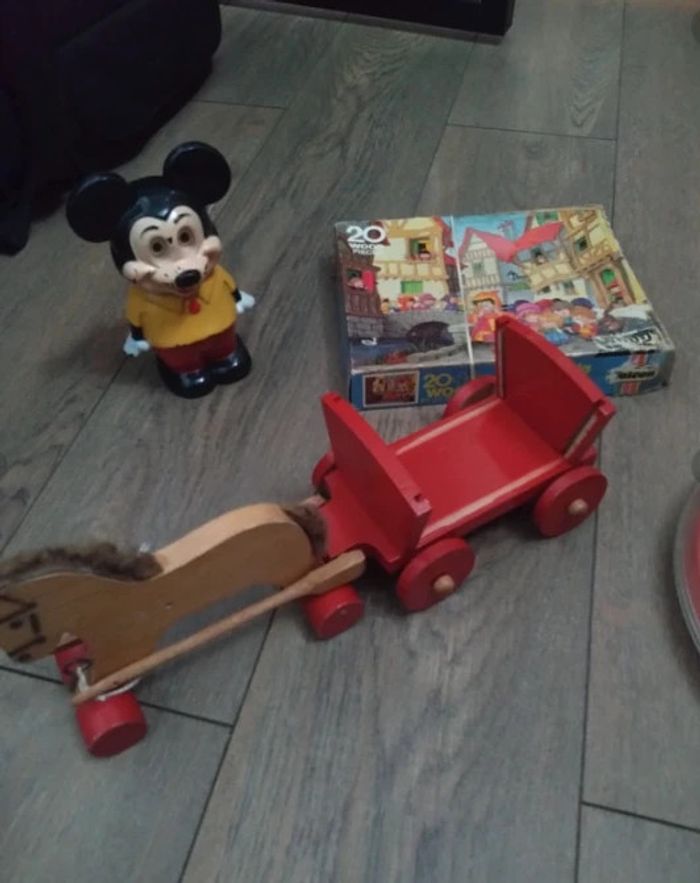 Mickey datant année 80 Un puzzle année 60 en bois complet Un xilophone Fisher Price 1964 Un cheval en bois et sa charrette années 50 60 Un jeu de construction en bois dans son coffret d'origine complet les bois de Megève style kapla Un flipper en plastique année 60 L'imprimerie de Mickey tampons années 60
