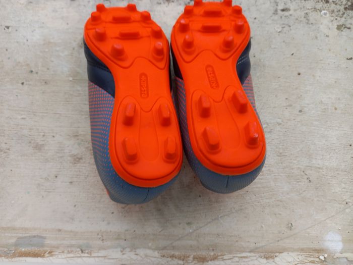 Description Paire de crampons pour la pratique du rugby. Couleurs : orange / bleu Lacets élastiques Pointure : 29 Très bon état (servis que 2 fois)