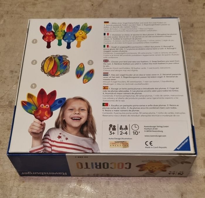 Dans Cocorito, quatre petits oiseaux ont perdu leurs plumes et ont besoin de votre aide pour les retrouver. A chaque tour, pioche une plume au hasard ou échange-en une avec le nid puis ajoute-la à ton oiseau. En fin de partie, toutes les plumes de ta couleur te rapporteront des points. Récupère un maximum de points pour remporter la partie ! Dès 3 ans.