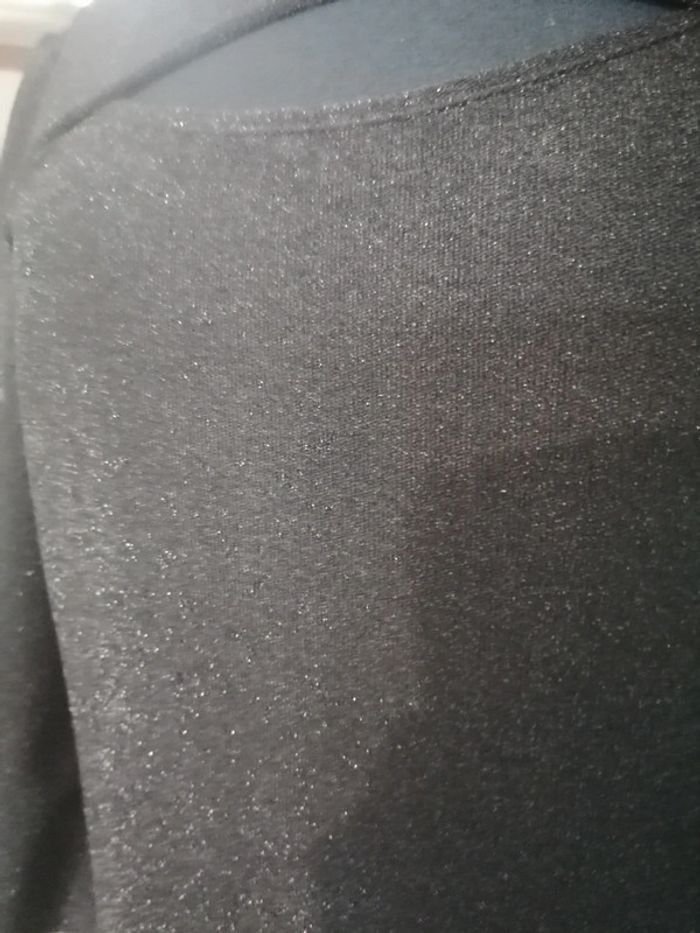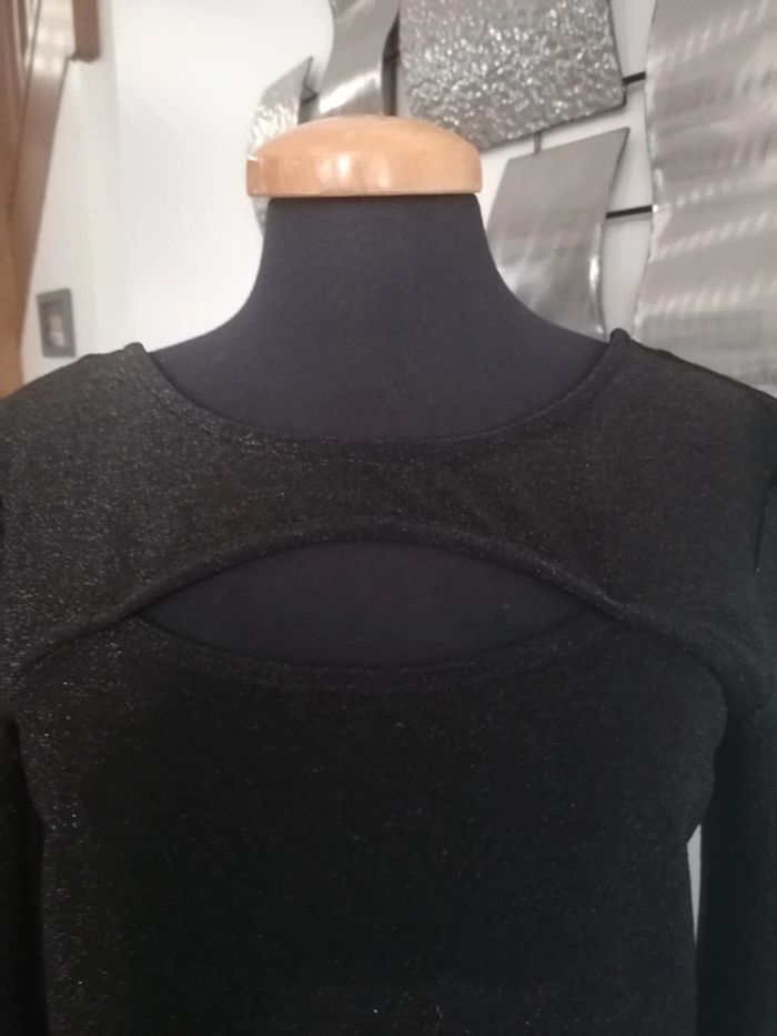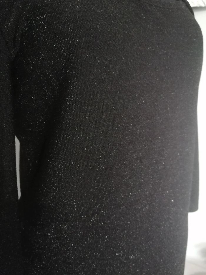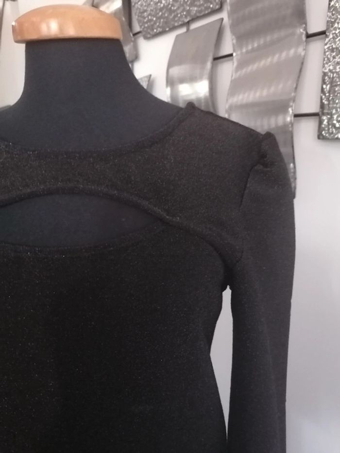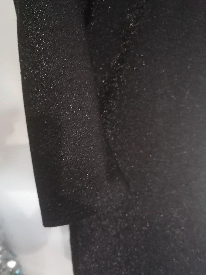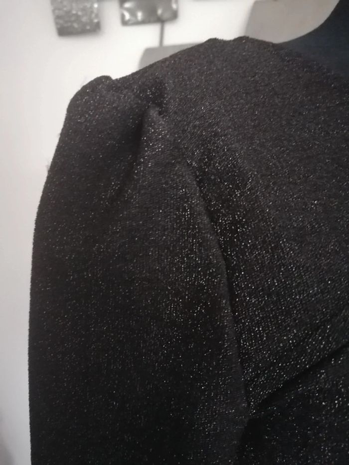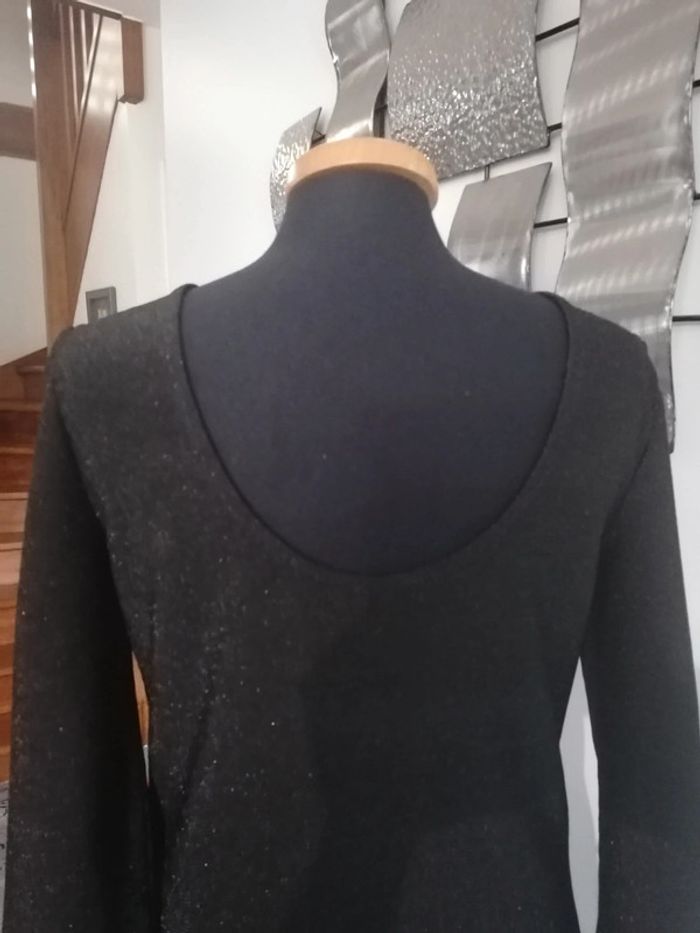 Très jolie robe noire effet pailleté Manches 3/4 Encolure ouverte sur le devant Et décolleté à l'arriere Porté qu'une seule fois parfaite pour les fêtes de fin d'année