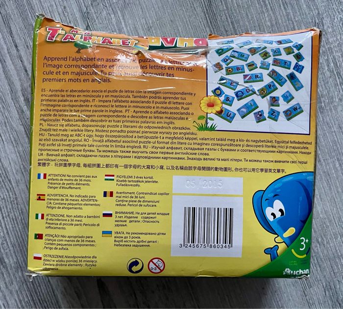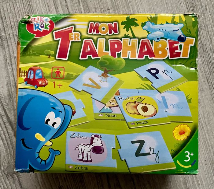 Jeu Mon premier alphabet de la marque Rik et Rok Puzzle de 2 pièces d’un objet et d’une lettre Complet Traces d’utilisation sur les pièces Boîte carton en mauvais état (voir photos) Occasion, bon état des pièces