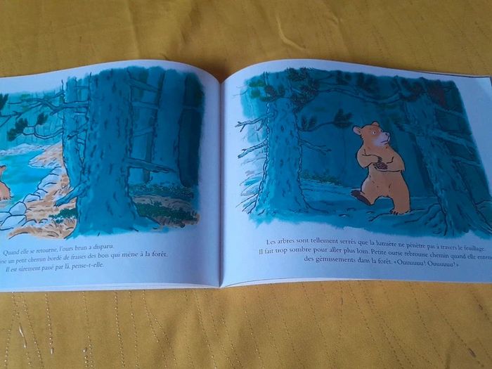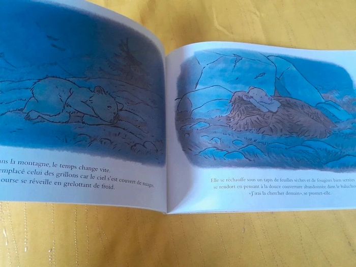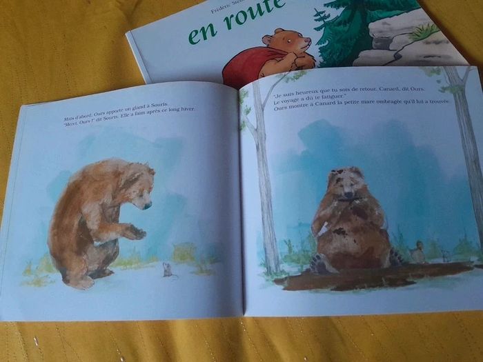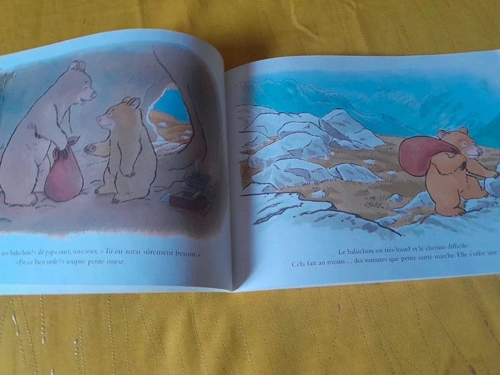 🎀Idéal Cadeau 🎁 de Noël 🤶🎄🎅 🎀🎄 🎅 🎄 🤶 Lot de 2 livres sur le thème des Ours > du voyage et de la solitude. En route Petite ourse a grandi. C’est le grand jour : à son tour de quitter la grotte paternelle. Quel bonheur ! Vite, en route ! À l’aventure ! Mais Papa ours, lui, est songeur. Après lui avoir préparé un baluchon bien garni, il la met en garde : « Sois prudente, petite ourse, le monde est plein de surprises ! » Petite ourse écoute à peine. Pourtant, elle va bientôt faire une drôle de rencontre et elle sera bien contente que Papa ours ait pensé à tout en remplissant son baluchon… Encore vendu 12.50€ #apprentissagedel'autonomie #entraide, solidarité #montagne #ours Ours a une histoire à raconter Avant d’entrer en hibernation, Ours a une histoire à raconter, mais ses amis sont trop occupés pour l’écouter. Malheureusement, le long hiver efface l’histoire de sa mémoire et, au printemps, Ours n’a plus rien à raconter. Oh, si ! lui soufflent ses amis, justement, la vie est un éternel recommencement… Encore vendu 12.50€ #amitié #canard, oie #générosité #grenouille, crapaud, têtard #hibernation #ours #souris, mulot, rat, campagnol #taupe #saisons