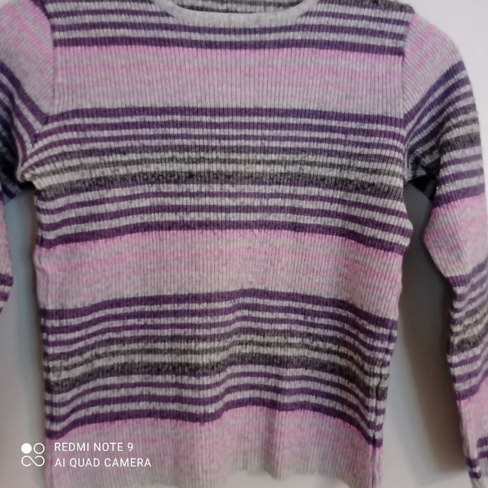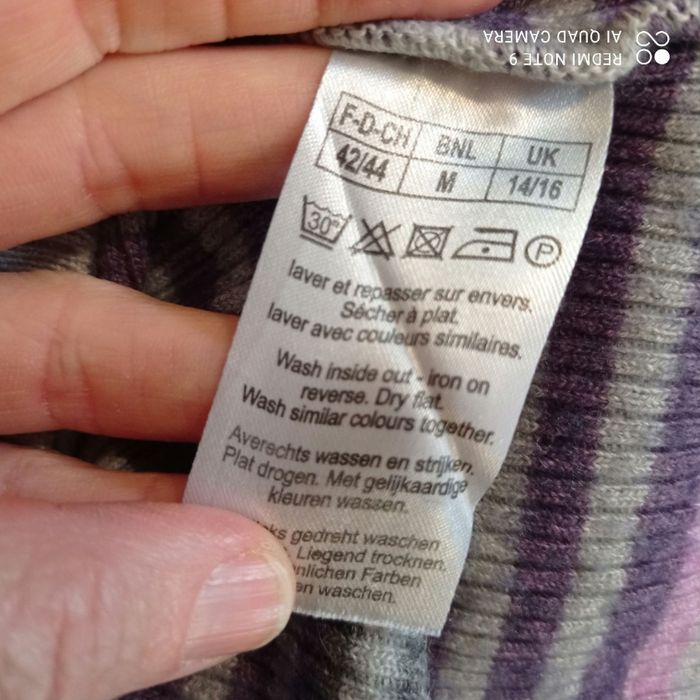 Étiqueté t42/44 mais selon moi taille beaucoup plus petit : voici les mesures prises à plat : épaules : 32 cm, aisselles : 44 cm, longueur : 51 cm. Composition : laine et acrylique voir photo de l étiquette. Il y a des bouloches voir photos.