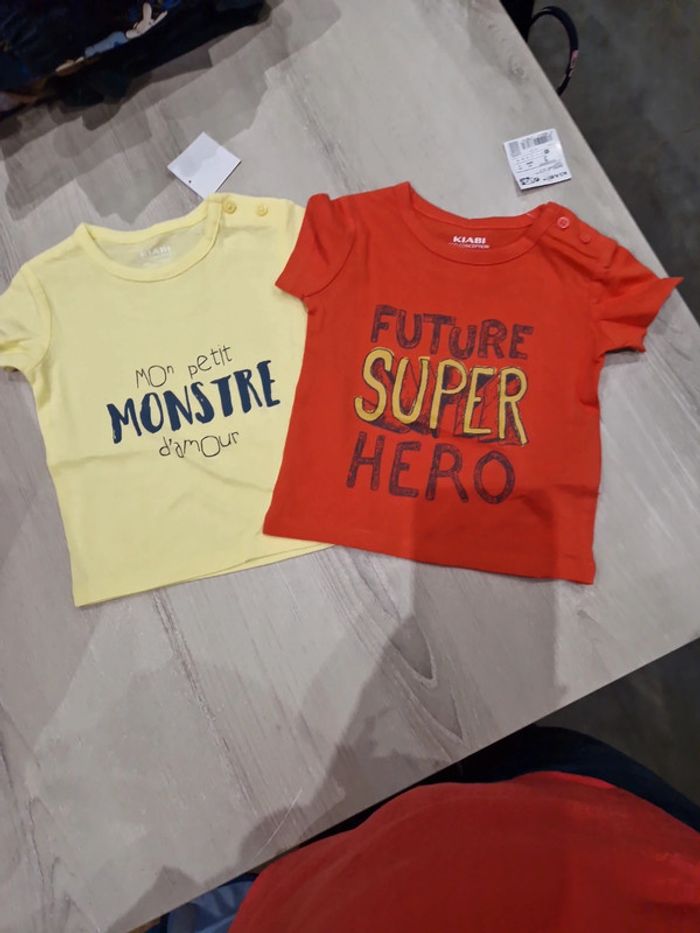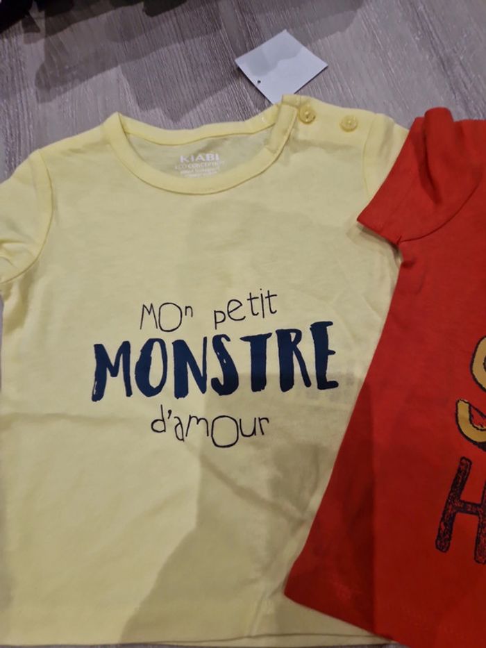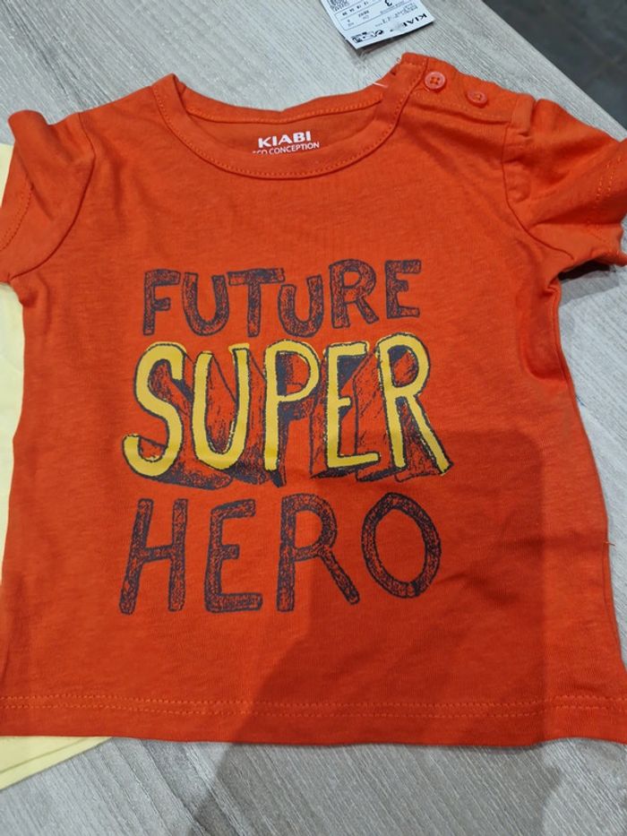 Lot de 2 tee shirt neuf 3mois Kiabi Jaune et orange Futur super héros Mon petit monstre d'amour