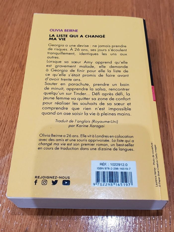 Livre La liste qui a changé ma vie de Olivia Beirne. Dans la vie, Georgia a une devise : ne jamais prendre de risques. Les jours s'écoulent tranquillement, identiques les uns aux autres. À 26 ans, elle s'est enfermée dans une routine qui lui donne l'impression que la vie n'est qu'une longue route sans grand intérêt. Mais un jour, elle apprend que sa soeur, si audacieuse et si entreprenante, est malade et ne pourra pas atteindre son but : cocher sur une liste tout ce qu'elle s'était promis de faire avant d'avoir trente ans. C'est Georgia qui va devoir terminer cette liste à sa place. Sauter en parachute, prendre un bain de minuit, apprendre la salsa, rencontrer quelqu'un sur Tinder... Défi après défi, la jeune femme va quitter son petit confort pour réaliser les souhaits de sa soeur. Et ainsi comprendre que rien n'est impossible quand on ose saisir la vie à pleines mains. 352 pages. Éditions City Edition.