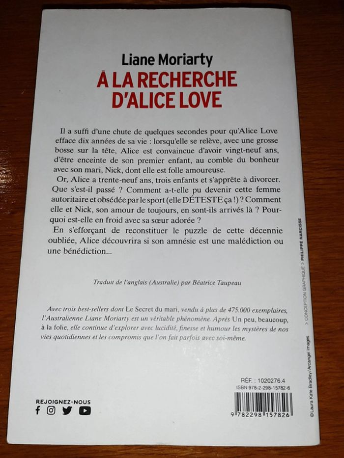 Livre A la recherche d'Alice Love de Liane Moriarty. Résumé: Il a suffi d’une chute de quelques secondes pour qu’Alice Love efface dix années de sa vie : lorsqu’elle se relève, avec une grosse bosse sur la tête, Alice est convaincue d’avoir vingt-neuf ans, d’être enceinte de son premier enfant, au comble du bonheur avec son mari, Nick, dont elle est folle amoureuse. Or, Alice a trente-neuf ans, trois enfants et s’apprête à divorcer. Que s’est-il passé ? Comment a-t-elle pu devenir cette femme autoritaire et obsédée par le sport (elle DÉTESTE ça !) ? Comment elle et Nick, son amour de toujours, en sont-ils arrivés là ? Pourquoi est-elle en froid avec sa sœur adorée ? En s’efforçant de reconstituer le puzzle de cette décennie oubliée, Alice découvrira si son amnésie est une malédiction ou une bénédiction... Format broché. Éditions Albin Michel 2019. ISBN 978-2-298-15782-6