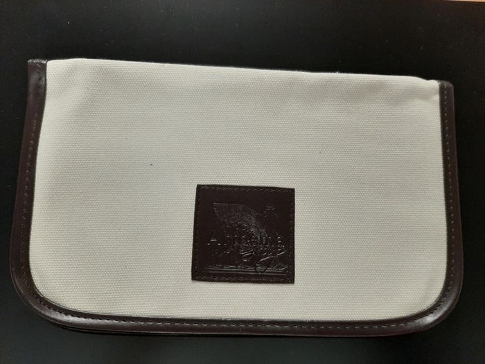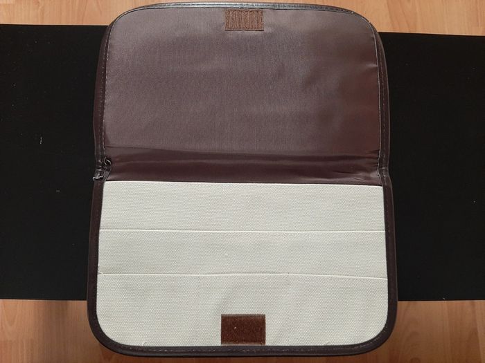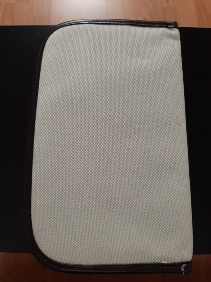 Pochette porte-documents porte-cartes en toile beige et bordures en similicuir marron. 2 longues poches + 3 petites pour les cartes. Dimensions : 27,5 × 17 cm.