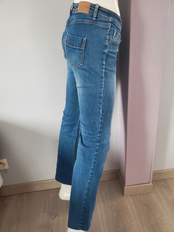 Jeans bleu effet usé. Taille basse, coupe droite. 99% coton, 1% élasthanne. Taille 40.
