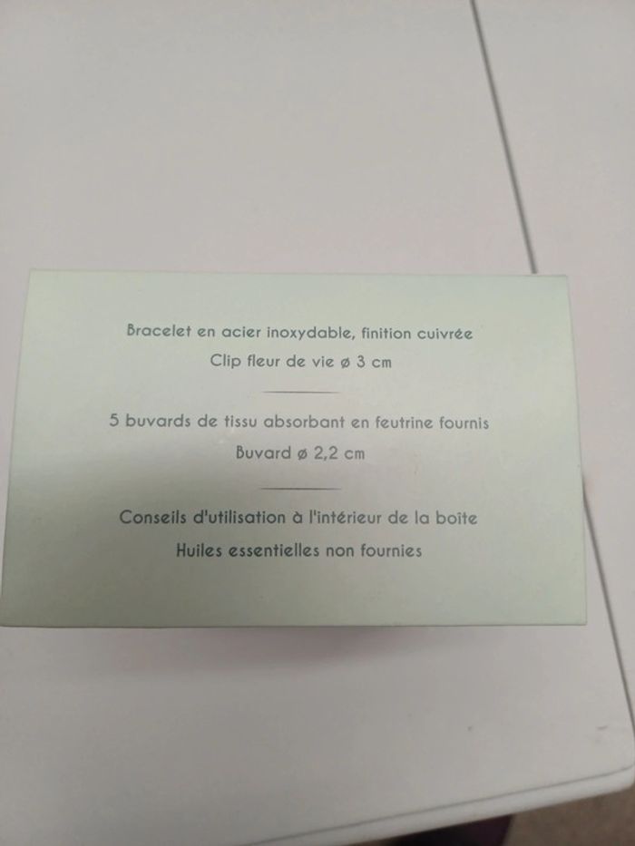 Bracelet fleur de vie diffuseur d'huiles essentielles neuf. Diffuseur d'huiles essentielles Bracelet fleur de vie et finition cuivré - [DESCRIPTION] Bracelet diffuseur en métal de forme ronde motif fleur de vie . Le diffuseur dispose d'un buvard de tissus en couleur à imbiber d'huiles essentielles. Bien plus qu'un simple bijou, ce bracelet diffuseur permet de profiter des bienfaits des huiles essentielles tout au long de la journée. [CARACTÉRISTIQUES] Bracelet diffuseur en acier inoxydable. 5 buvards colorés en feutrine. Diamètre du diffuseur : 3 cm. Diamètre du buvard : 2,2 cm. [CONSEILS D’UTILISATION] Ouvrir le bracelet et sortir le buvard de feutrine colorée. Imbiber le buvard de quelques gouttes d’huiles essentielles. Remettre le buvard dans le bracelet et refermer. A1
