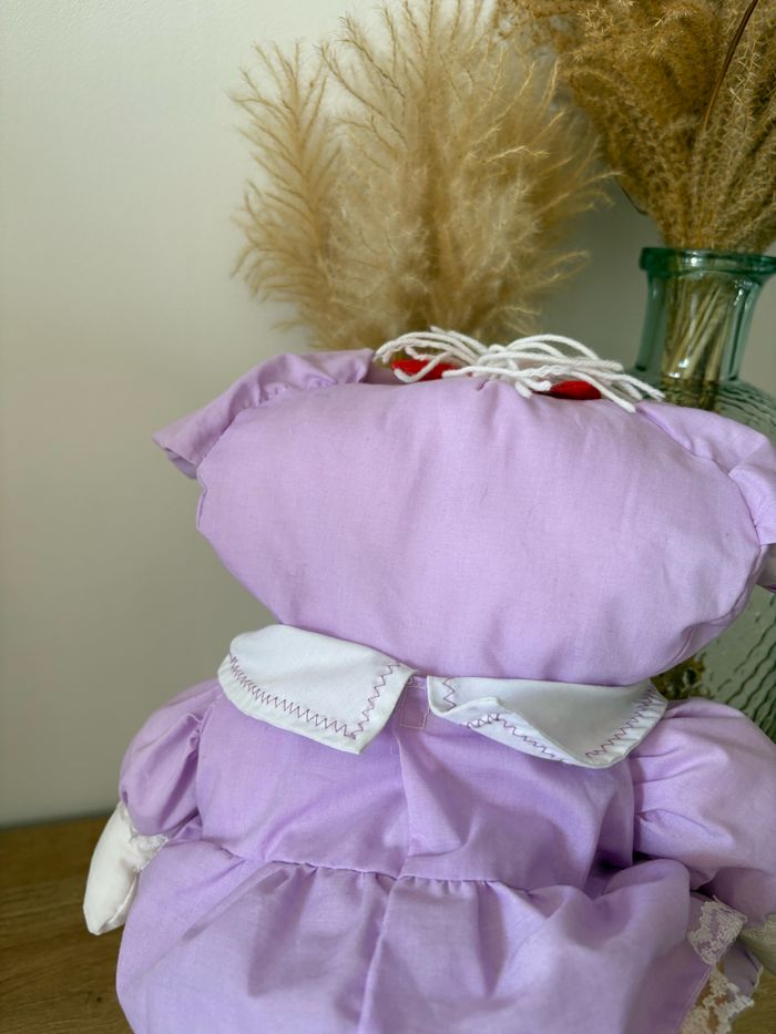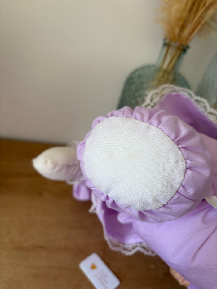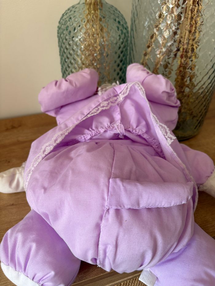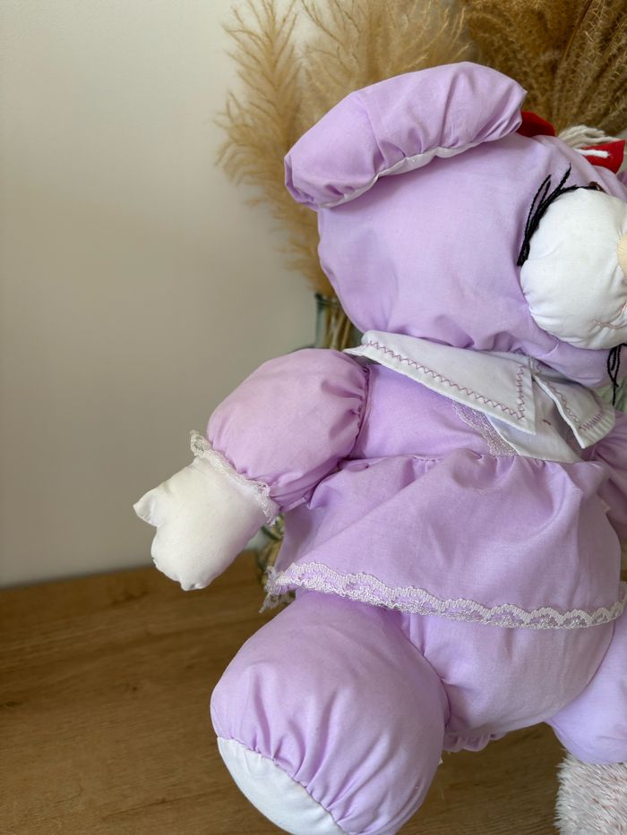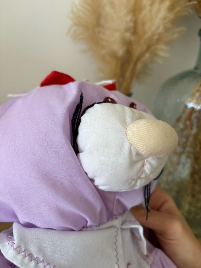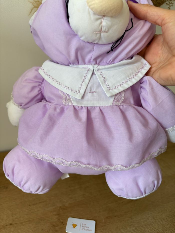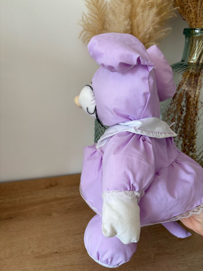 Peluche ancienne Souris violette/ dentelle/ blanche Mèche style laine, noeud rouge Environ 40 cm Des minis taches sur les parties blanche non parties au lavage . Elle reste superbe et en bel état ! Vendu comme sur les photos