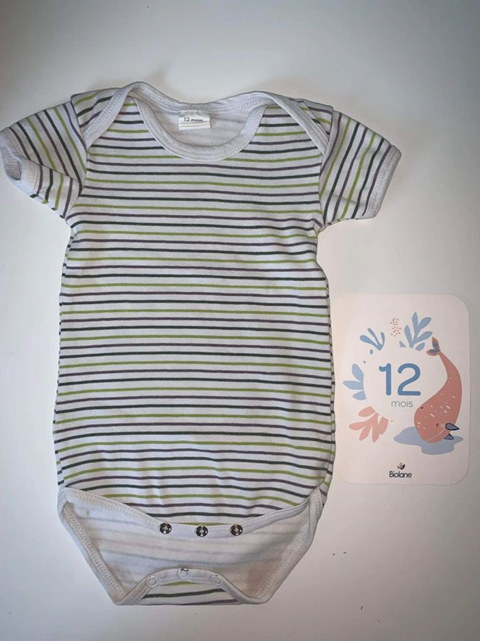 Bodie manches courtes rayé ( fond blanc et lignes vertes ) Taches mais a l’intérieur en bas 12 mois #12moisgarconalexiaguillou2206