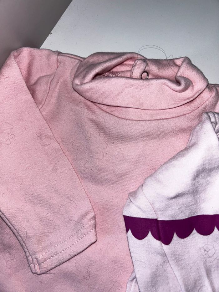 Lot de trois bodies manches longues. Un à col roulé uni , un aspect corset , un blanc fleuri . Marque : in extenso , sans marque , baby . Le lot 5€ #6moisfillealexiaguillou2206