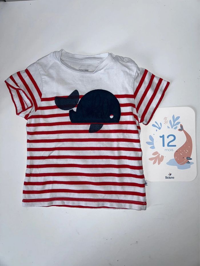 Tee shirt manches courtes. Rayé rouge sur fond blanc . Motif «  baleine » Obaibi 12 mois #12moisgarconalexiaguillou2206