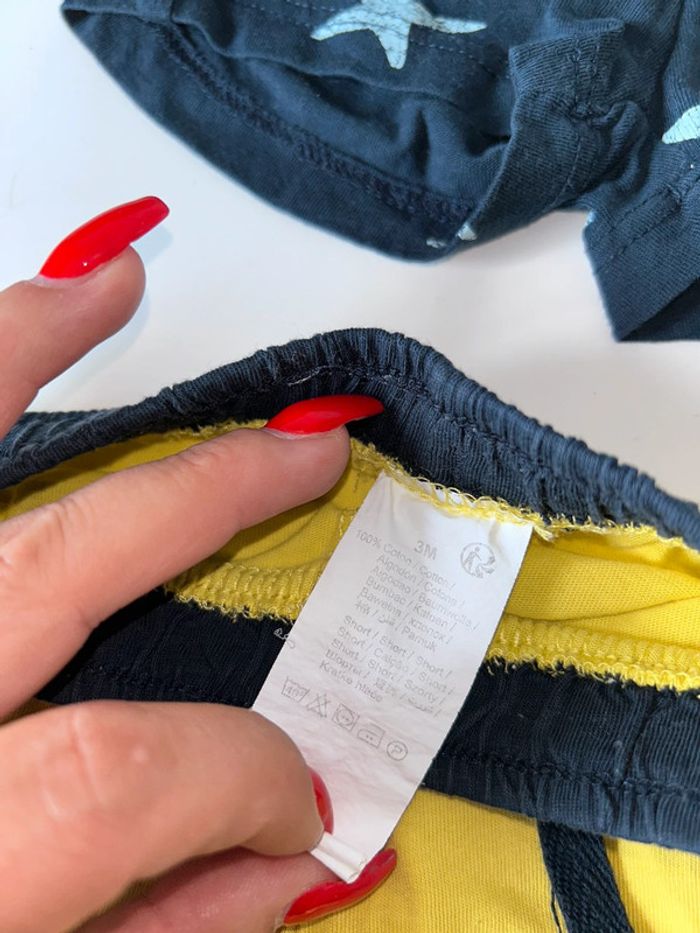 Lot de deux short en coton , lien à la taille et élastique Un bleu foncé avec étoiles bleu clair Un jaune avec ceinture élastique et lien bleu marine Le lot 4€ #3moisgarconalexiaguillou2206