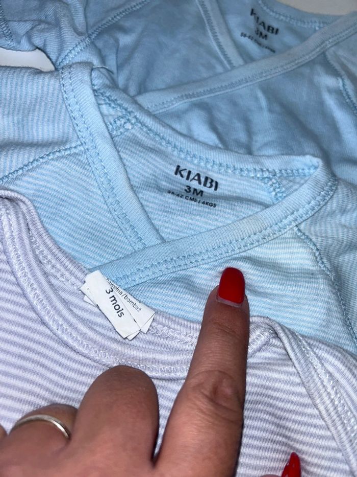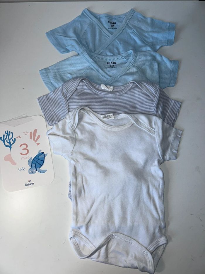 Lot de 4 bodies manches courtes 2 kiabi qui s ouvrent devant 2 tissaia Les bleus sont taché ( voir photo ) sinon le le blanc un peu jauni a l encolure , le reste ok 3 mois #3moisgarconalexiaguillou2206