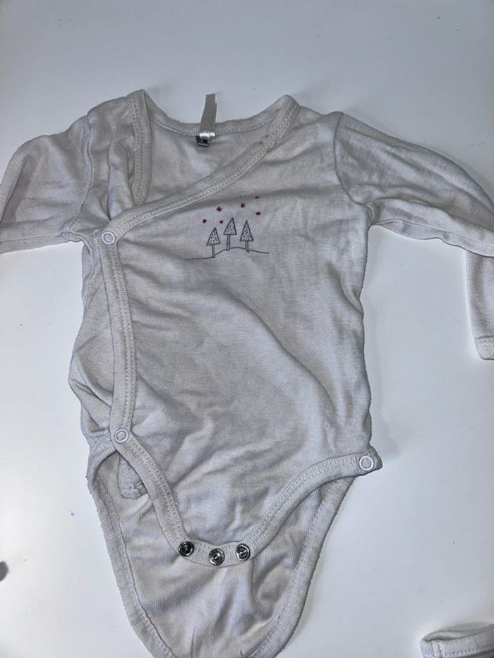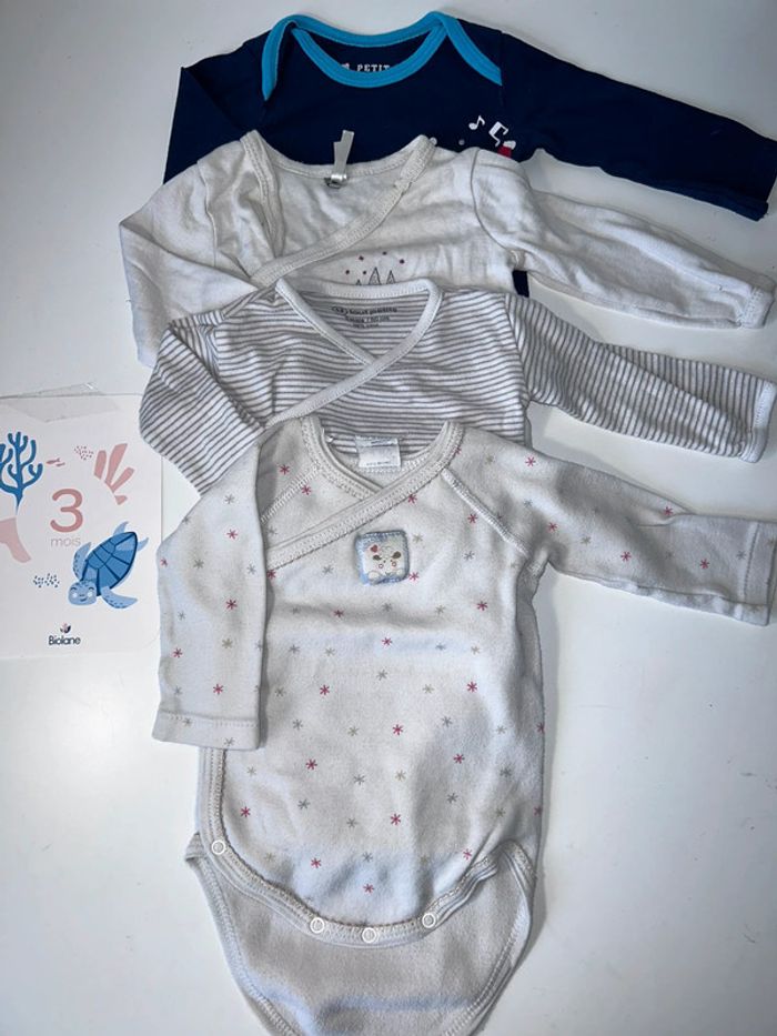 Lot de 4 bodies manches longues ( dont 3 qui s ouvrent aussi par devant ) 1 a l’encolure un peu jauni ( orchestra ) 1 en excellent état ( petit béguin ) 2 en bon état général ( u tout petits et absorba. pas de taches ni rien , juste portes par deux enfants ) Le lot 5€ #3moisgarconalexiaguillou2206