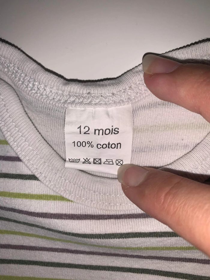 Bodie manches courtes rayé ( fond blanc et lignes vertes ) Taches mais a l’intérieur en bas 12 mois #12moisgarconalexiaguillou2206