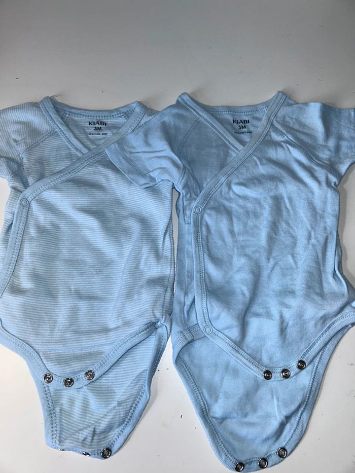 Lot de 4 bodies manches courtes 2 kiabi qui s ouvrent devant 2 tissaia Les bleus sont taché ( voir photo ) sinon le le blanc un peu jauni a l encolure , le reste ok 3 mois #3moisgarconalexiaguillou2206