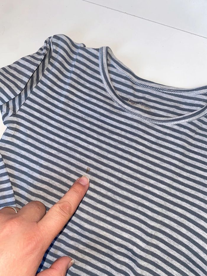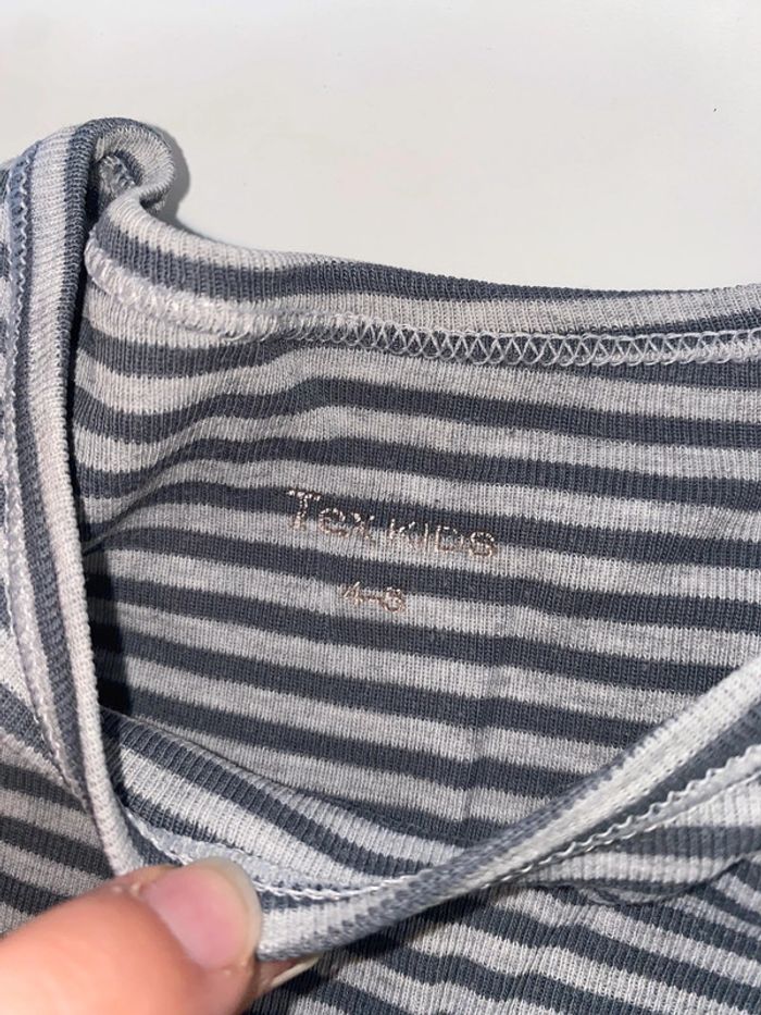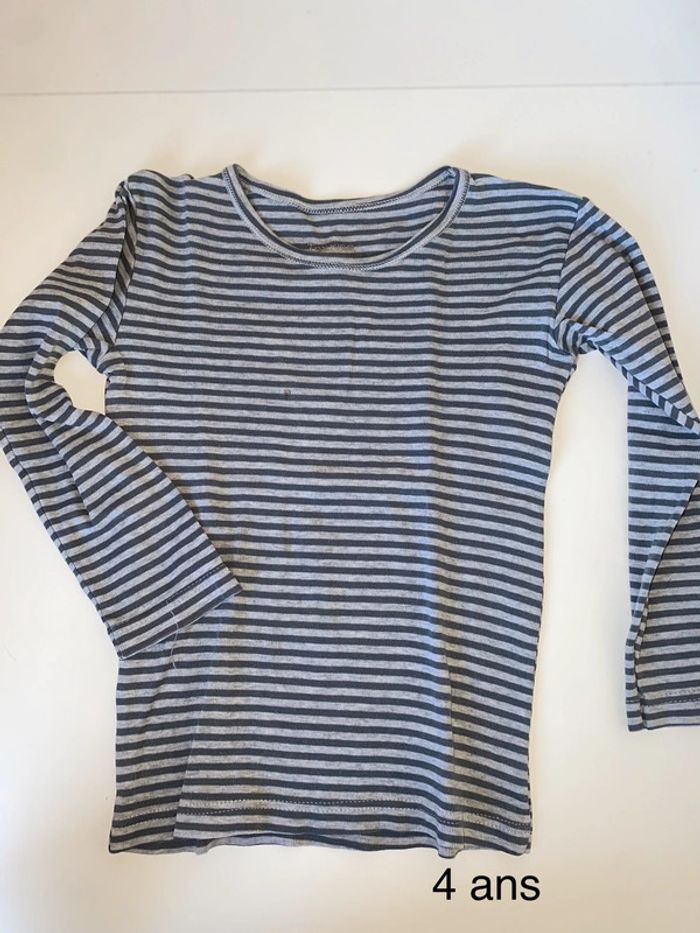 Tee shirt manches longues à rayures dans les tons de gris . Une petite tache ( voir photo ) , sinon le reste ok Noté 4/5 ans mao correspond à un 4 ans #4ansgarconalexiaguillou2206
