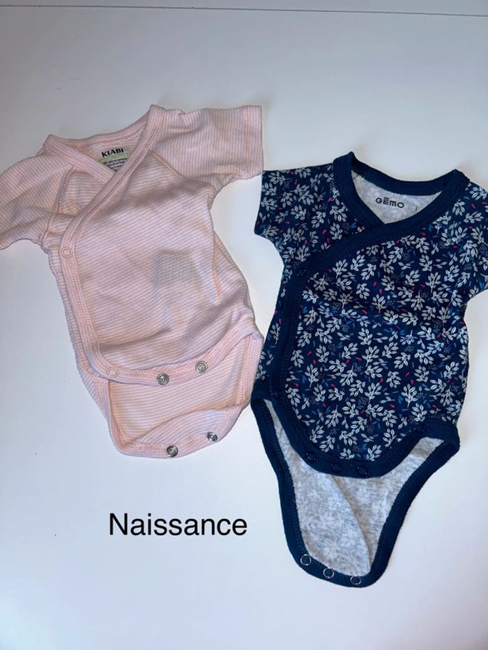 Lot de deux bodies naissance manches courtes . Ouverture par devant , aussi appelé croisé et cache cœur Très peu porté Marque : 1 gemo et 1 kiabi Naissance - 0 mois Le lot 5€ #naissancefillealexiaguillou2206