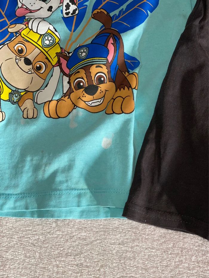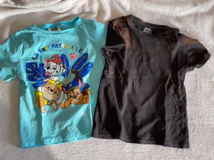 Lot de deux tee shirt Un noir et un bleu clair pat patrouille ( tachés mais peuvent peut être être teints , ou pour jouer dehors ) 4 ans Le lot 1€ #4ansgarconalexiaguillou2206
