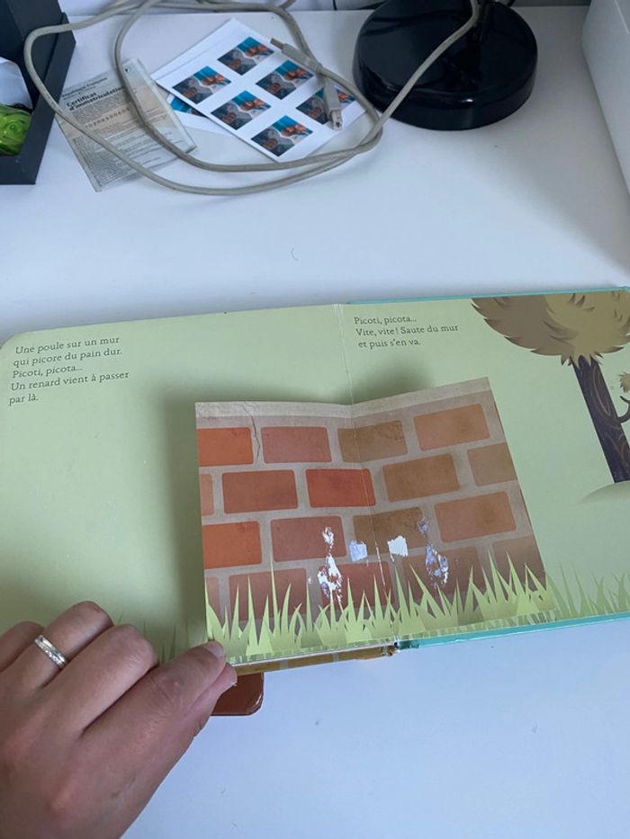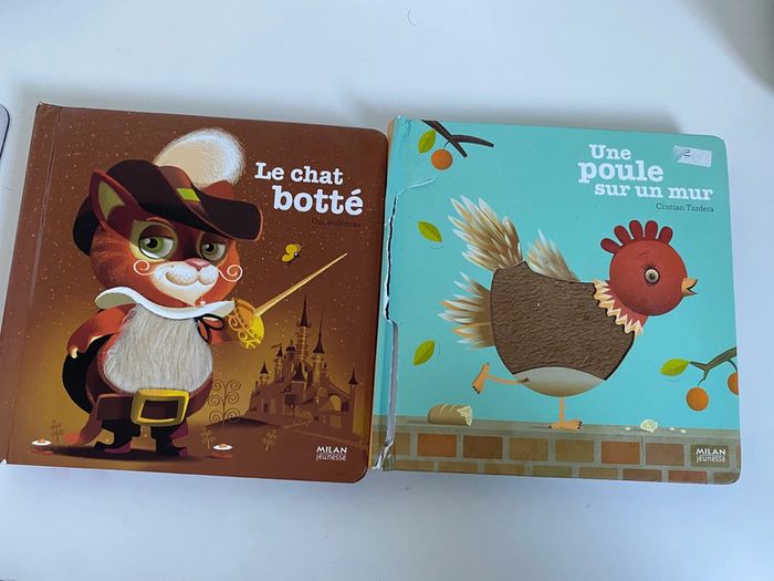 Lot de deux livres à toucher - Une poule sur un mur ( satisfaisant ) , je dois avoir la poule encore , il faut juste la recoller - Le chat botté ( bon état ) Voir sur les photos les endroits abîmés . Neuf il vaut 13€ pièce , je les laisse à 3€ le lot Milan jeunesse #livresalexiaguillou2206