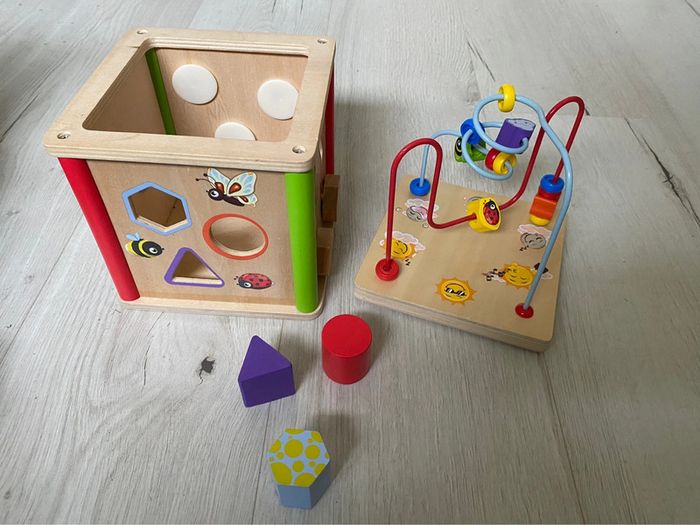 Cube en bois d ´activité ( jeu des formes , boulier , heure , ronds qui tournent , chemins à faire .. ) #jeuxalexiaguillou2206