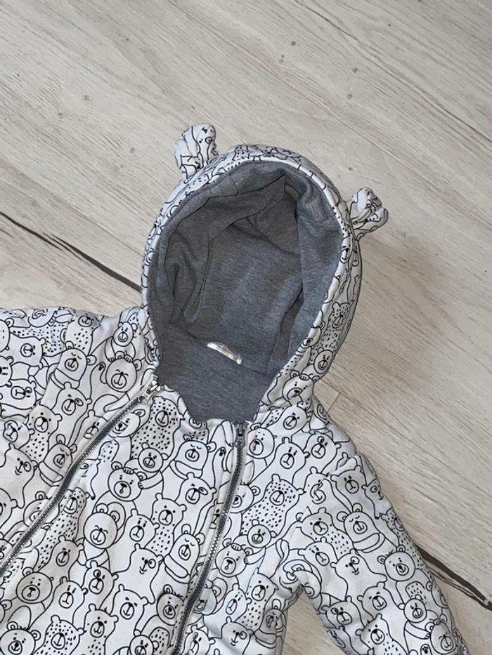 Capuche à petites oreilles , moufles intégrés ( qui peuvent laisser aussi les mains libres ) et pieds couverts