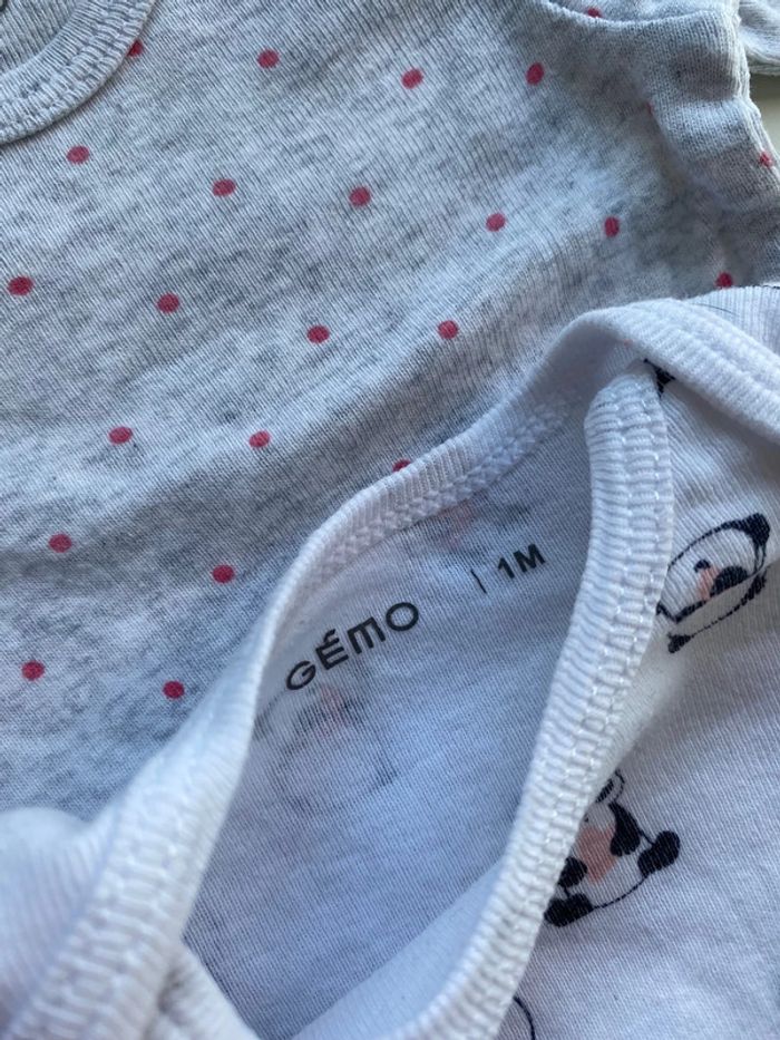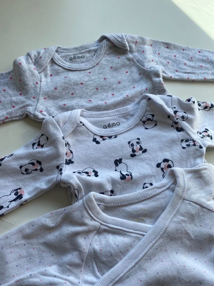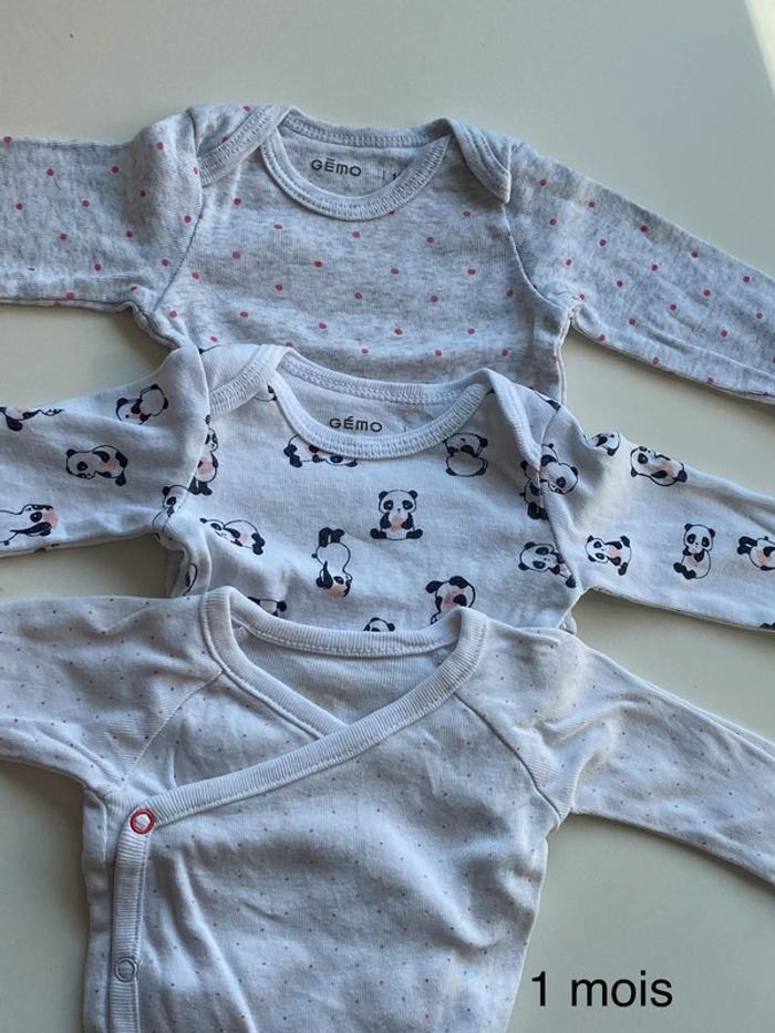 lot de 3 bodies à manches longues « panda , gris ponts rose , et pleins de petits points de couleurs » marque : gemo et brioche 1 mois le lot 5€ #1moisfillealexiaguillou2206