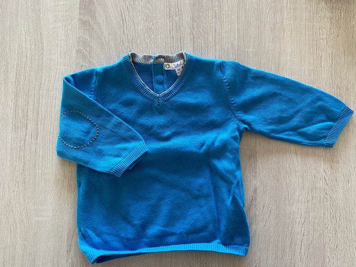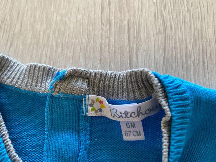 pull col v , bleu et gris coudes avec surpiqûres très joli 6 mois #6moisgarconalexiaguillou2206