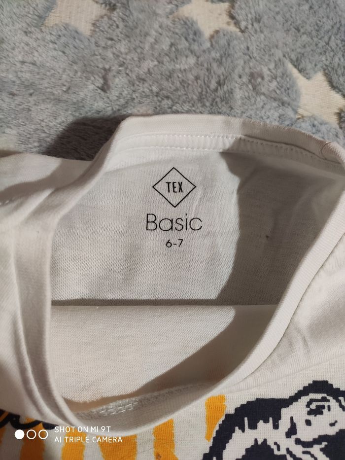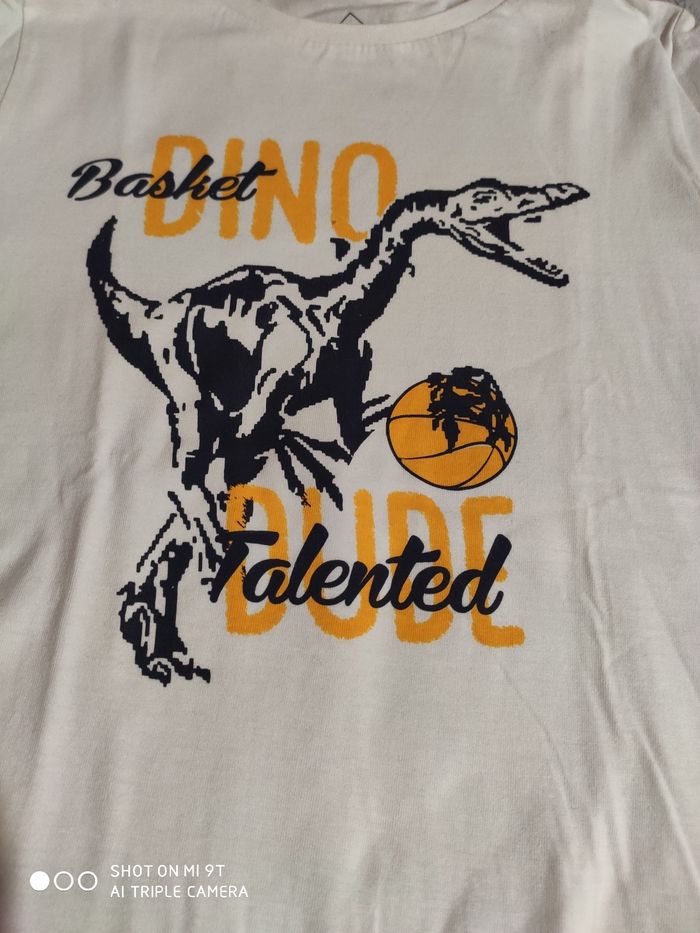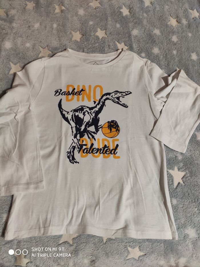Tee shirt manches longues garçon taille 6/7 ans en très bon état, pas de tâches ni trous. Couleur blanc avec un dinosaure sur le devant de chez Tex. Taille correctement et porté par un seul enfant sur une saison.