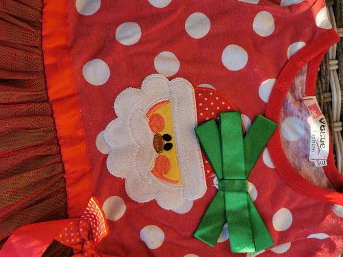 Très belle robe tunique de Noël. Motif tête du père Noël et tule couleur de Noël pour la jupe. Le rouge est un peu décoloré du au lavage. vu le froid de l'hiver si vous mettez un gilet cela ne se verra pas. Petit chaussons ou petite marionnette pour jouer avec. Voir messures pour tout complément d'informations Correspondant à un 24 mois 36 mois.