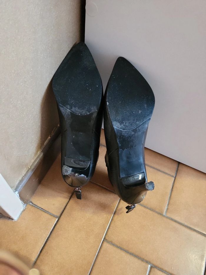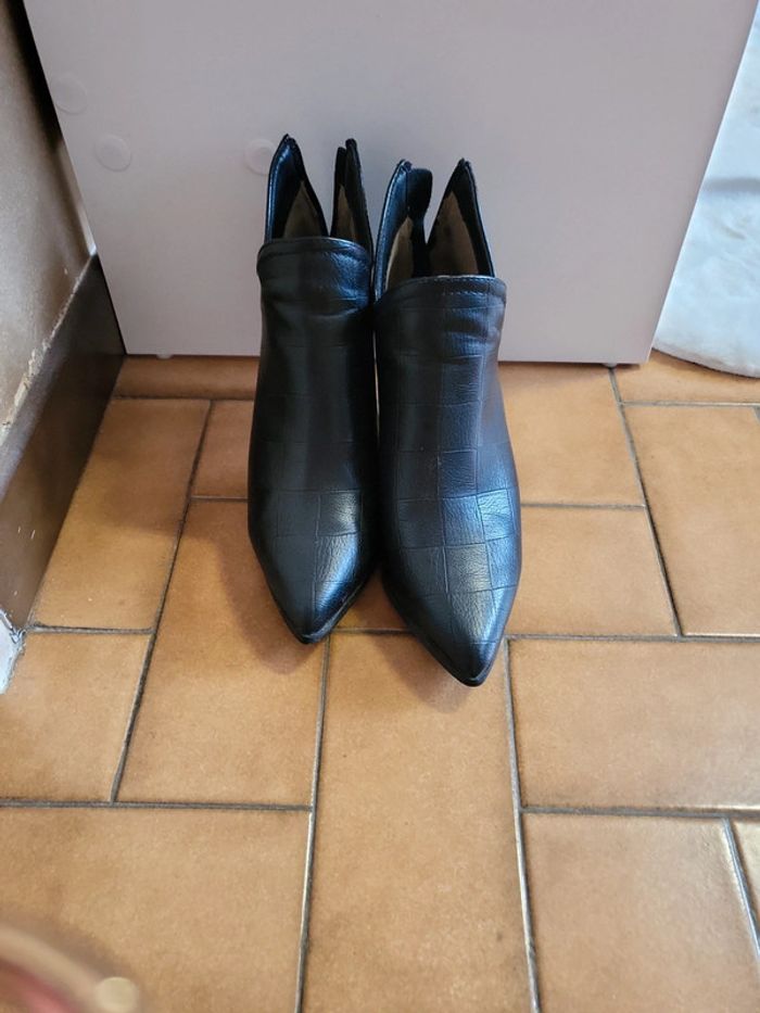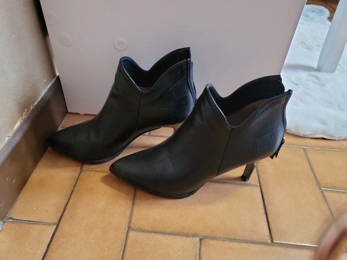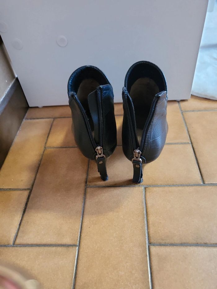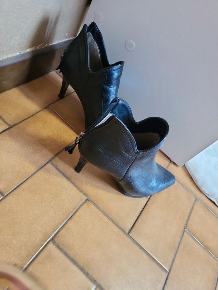 Bottines à talons, 8 cm, bout pointu. S'attache par fermeture éclair. Très bon état. T. 39