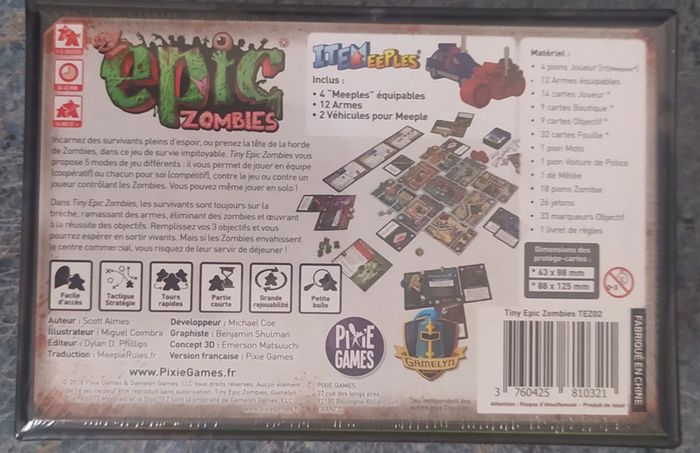Ludipresta : Vente professionnelle - Jeu de société sous emballage - Prix Ferme Français à partir de 14 ans 30mn à 1h 1 à 5 joueur(s) Mécanisme(s) : Dés, Coopératif Dans Tiny Epic Zombies, les survivants sont toujours en fuite, récuperant des armes, tuant des zombies et travaillant ensemble pour atteindre leurs objectifs. Complétez 3 objectifs pour gagner la partie, mais si vous êtes trop concentré sur les objectifs, les Zombies envahiront le centre commercial et ce sera la fin pour vous. En fonction du mode de jeu choisis, vous pourrez jouer soit les Survivants, les Zombies. Vidéo : https://www.youtube.com/watch?v=anBB2P437Y8