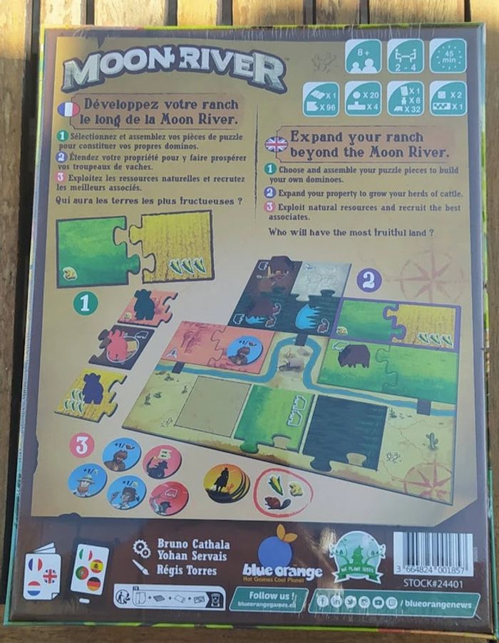 Ludipresta : Vente professionnelle - Jeu de société sous emballage - Prix Ferme Français, Anglais à partir de 8 ans 30mn à 1h 2 à 4 joueur(s) Mécanisme(s) : Tuiles, Placement Développez votre ranch le long de la Moon River Vous venez d’hériter de terres de l’autre côté de la fameuse Moon River. Champs de maïs ? Prairies ? Forêts ? Qu’allez-vous y découvrir ? À vous d’assembler vos parcelles de la façon la plus astucieuse afin d’y faire prospérer vos troupeaux, créant ainsi un ranch légendaire. Mais le Far West n’est pas sans danger : saurez-vous faire face à la rudesse du climat et aux coups bas de vos adversaires ? Sélectionnez et assemblez vos pièces de puzzle pour constituer vos propres dominos. Étendez votre propriété pour y faire prospérer vos troupeaux de vaches. Exploitez les ressources naturelles et recrutez les meilleurs associés. Qui aura les terres les plus fructueuses ? Vidéo : https://www.youtube.com/watch?v=5b-Ir-c5isQ&ab_channel=BlueOrangeFrance