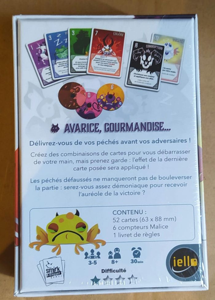 Jeu de société sous emballage - Prix Ferme Français à partir de 8 ans moins de 30mn 3 à 5 joueur(s) Délivrez-vous de vos péchés avant vos adversaires ! L'avarice, l'orgueil, la haine... seulement trois des 7 péchés capitaux que vous rencontrerez dans ce petit jeu de cartes sournois, sur le thème des 7 péchés capitaux. Faites de votre mieux pour vous en débarrasser le plus rapidement possible, tandis que vos adversaires font tout leur possible pour remplir votre main. Videz votre main trois fois pour gagner et devenez la convoitise de tous vos amis ! Jouez autant de cartes que possible à chaque tour, de la même couleur, valeur numérique ou une suite de n'importe quelle longueur, en essayant de vider votre main le plus rapidement possible, tout en empêchant vos adversaires de faire de même. La carte la plus haute de la série que vous jouez active la capacité de cette couleur, ce qui vous aide à aller plus loin ou met vos adversaires dans l'embarras. Chaque fois que vous réussissez à vider votre main (et que vous réussissez à la garder vide jusqu'à la fin du tour), votre nouvelle main de départ sera deux cartes plus petites que la fois précédente, comme le montre votre jeton Méchanceté. (6, 4, 2, 0) Videz votre main trois fois, et vous GAGNEZ ! Vidéo : https://www.youtube.com/watch?v=r848qy3LTpM