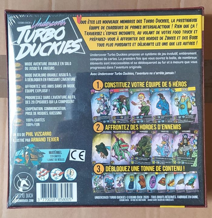 Jeu de société sous emballage - Prix Ferme de 1 à 5 joueurs dès 10 ans Undercover Turbo Duckies est un jeu de société au scénario évolutif intégrant un mode solo. Chaque joueur ou équipe devra au volant de votre Food truck, affronter "incognito" des hordes de Zbires et Boss (malfrats) tous plus puissants et délirants les uns que les autres. Le jeu entièrement composé de cartes, propose 20 scénarios différents au cours desquels vous pourrez personnaliser votre équipe et découvrir de nombreuses surprises. A vous de relever le défi dans cet espace intersidéral où de redoutables adversaires vous attendent. But du jeu : Terminer les 20 épisodes de l'histoire et envoyé derrière les barreaux, les 20 criminels les plus dangereux de l'univers. Un jeu familial original qui plaira aux joueurs éclairés et également aux plus curieux. vidéo : https://www.youtube.com/watch?v=9egw6U0sFy4&ab_channel=GirldotGame Ludipresta