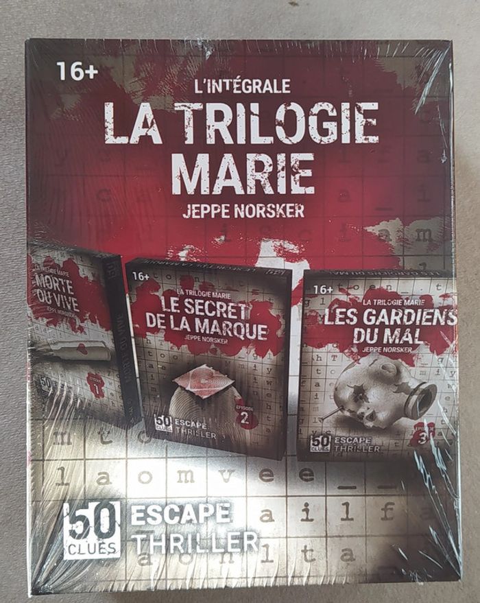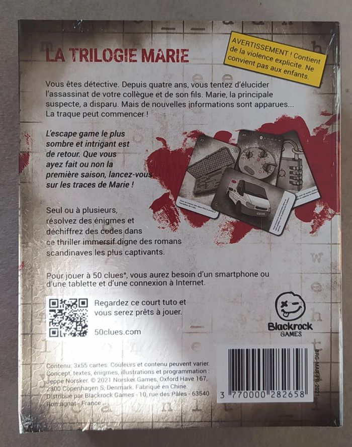 Jeu de société sous emballage - Prix Ferme Français à partir de 16 ans 1 à 2h 1 à 5 joueur(s) L’escape game le plus sombre et intrigant est de retour. 50 Clue est un Escape Thriller. Vous êtes un personnage qui doit résoudre des énigmes, déchiffrer des codes et faire des choix logiques pour avancer dans un thriller réaliste. Préparez-vous à vivre une expérience immersive qui mêle déduction et réflexion dans une ambiance de polars scandinave ! Que vous ayez fait ou non la première saison, lancez-vous dans cette enquête palpitante ! 4 ans se sont écoulés, vous incarnez un détective à la recherche de Marie et de ses terribles secrets. Episode 1 : Morte ou Vive: Vous êtes détective. Depuis quatre ans, vous tentez d’élucider l’assassinat de votre collègue et de son fils. Marie, la principale suspecte, a disparu. Mais de nouvelles informations sont apparues... « Morte ou vive » est le premier volet de la trilogie Marie. Episode 2 : Le Secret de la Marque: Des enfants sont piégés dans l'obscurité d'un lieu inconnu. Leur ravisseuse est morte, vous devez sauvez les enfants avant qu'il ne soit trop tard. « Le Secret de la Marque » est le second volet de la trilogie Marie. Episode 3 : Les Gardiens du Mal: Il y a quatre ans, le cadavre d’un enfant a mystérieusement disparu. Aujourd’hui, des indices sont apparus, mais certaines personnes veulent vous empêcher de retrouver le corps du garçon. « Les gardiens du Mal » est le troisième volet de la trilogie Marie Ludipresta