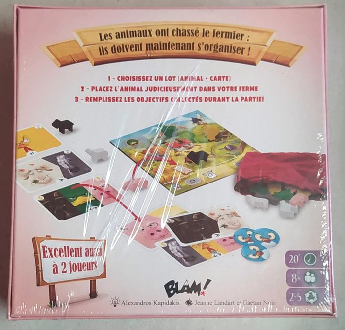Jeu de société sous emballage - Prix ferme 2 à 5 joueurs dès 8 ans Farm Club, un jeu rapide de placement et d’optimisation. La révolte a sonné et les animaux ont chassé les fermiers ! Mais la liberté retrouvée ne remplit pas les auges et il faut vite s’organiser pour que les récoltes soient aussi fructueuses que du temps des humains. Farm Club est un jeu d’optimisation aux règles simples mais aux décisions cruciales. A son tour, parmi les lots (animal + objectif) à sa disposition, le joueur choisit celui dont la combinaison sert le mieux sa stratégie : faut-il prendre un mouton ou un canard ? A quel endroit le placer dans sa ferme ? Quel nouvel objectif semble réalisable ? Avec seulement 9 tours de jeu, Farm Club se révèle rapide et demande en permanence du discernement : chaque animal, objectif ou placement influe sur le score final et il convient d’utiliser à bon escient les 2 actions spéciales qui permettent de réorganiser sa ferme ou de renouveler l’offre d’animaux et d’objectifs. Farm Club séduit par son thème amusant, sa richesse stratégique malgré sa simplicité d'accès et le plaisir addictif de manipuler les pions animaux en bois ! Ludipresta