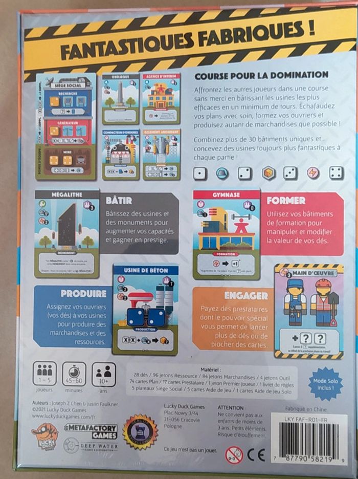 Jeu de société sous emballage - Prix ferme 1 à 5 joueurs à partir de 10 ans Fantastiques Fabriques, prenez part à une course pour la domination industrielle Affrontez les autres joueurs dans une course sans merci en bâtissant les usines les plus efficaces en un minimum de tours. Échafaudez vos plans avec soin, formez vos ouvriers et produisez autant de marchandises que possible afin d’assurer votre domination industrielle. Combinez plus de 30 bâtiments uniques et concevez des usines toujours plus fantastiques à chaque partie ! Dans Fantastique Fabriques, vous faites la course pour fabriquer le plus de marchandises ou pour construire les bâtiments les plus prestigieux. Pour gagner, un seul moyen : Bâtir - Former - Produire Chaque tour est divisé en deux phases, la phase de marché et la phase de travail. Pendant la phase de marché, vous choisissez d’acquérir un nouveau plan gratuitement ou de payer pour engager un prestataire. Les plans sont utilisés pour construire de nouvelles usines pendant la phase de travail. Les prestataires peuvent être utilisés pour renforcer votre stratégie en fournissant des ressources ou en vous permettant de lancer des dés supplémentaires. Pendant la phase de travail, tous les joueurs lancent simultanément leurs dés et utilisent leurs dés comme ouvriers pour diriger des usines. Une fois qu’un joueur a fabriqué 12 biens ou construit 10 bâtiments, la fin du jeu est déclenchée et un tour supplémentaire final est joué. Le joueur avec le plus de points remporte la partie