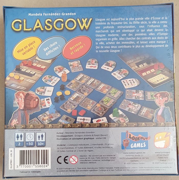 Jeu neuf sous emballage - prix ferme Retrouvez tous les jeux disponibles ici : https://www.myludo.fr/#!/profil/ludipresta-45241 2 joueurs dès 10 ans Glasgow est jeu pour deux joueurs sur la construction de la plus grande ville d’Écosse et la troisième du Royaume-Uni Au XVIIIe siècle, la ville a connu une profonde restructuration, sous l’influence des marchands qui ont développé ce qui allait devenir la Glasgow moderne, une des premières villes d’Europe organisée en grille. Allez chercher des contrats aux docks de la ville, achetez des immeubles, et laissez votre marque ! Collectez des marchandises pour bâtir des immeubles dans les rues de la ville en constante évolution. Lorsque la construction de la ville est terminée, la partie est finie, et le joueur qui a le plus de points l’emporte. Alors, qui de vous deux contribuera le plus au développement de la nouvelle Glasgow ?