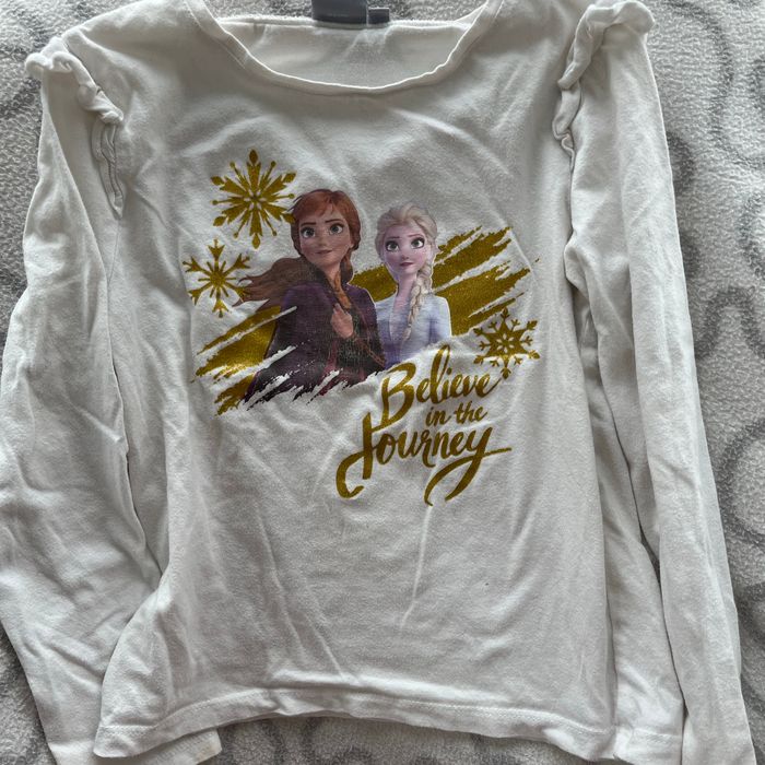 T-shirt manches longues la Reine des neiges Étiqueté 8 ans mais taille plus petit Image un peu passée Une mini tâche de feutre