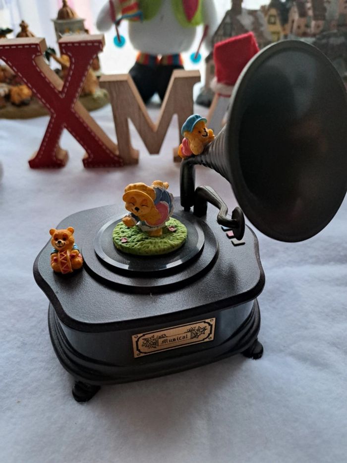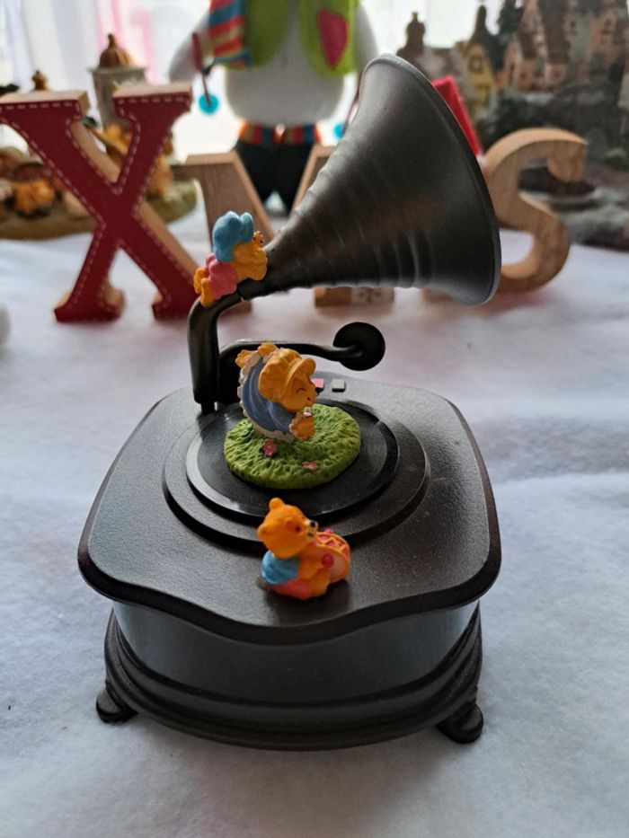 Boite à musique en forme de photographe avec 3 petits oursons Pour déclencher la musique il faut placer le bras sur le disque ainsi l'ours tourne