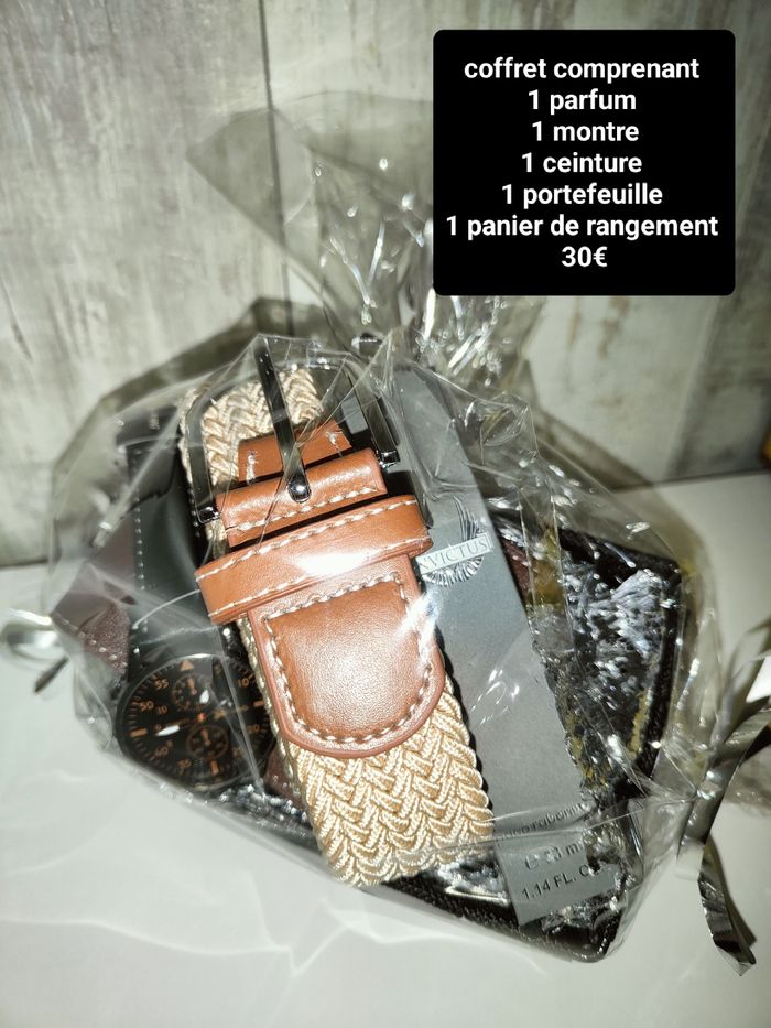 Coffret homme neuf comprenant 1 parfum 1 ceinture 1 montre 1 portefeuille 1 panier de rangement