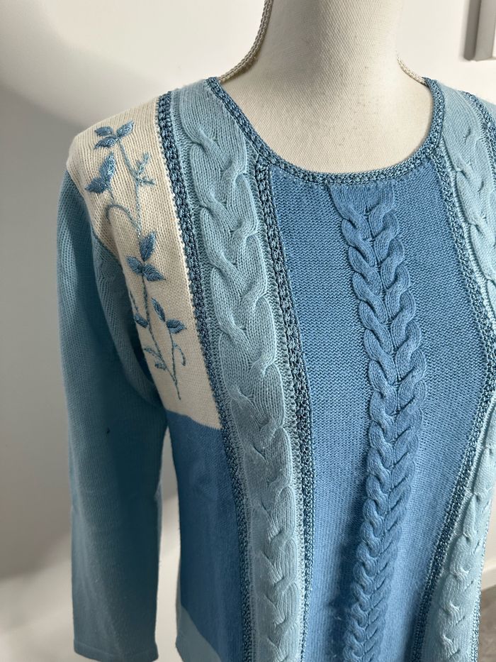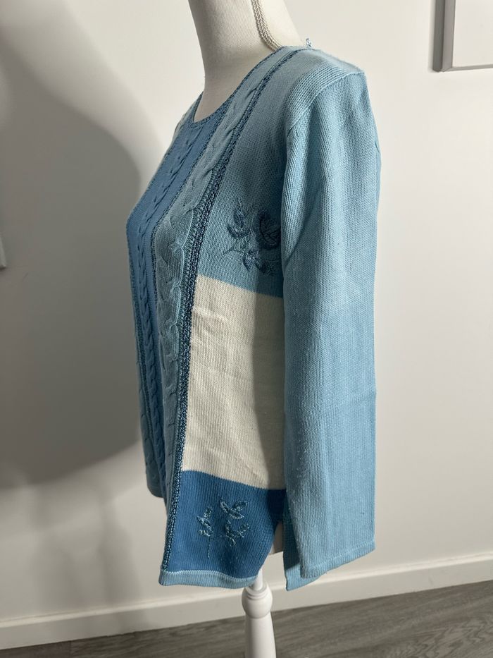 Pull patchwork mailles torsades broderies fleurs bleu et blanc Damart T38/40 M/L - photo numéro 5