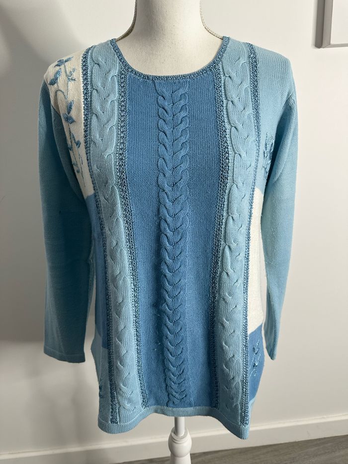 Pull patchwork mailles torsades broderies fleurs bleu et blanc Damart T38/40 M/L - photo numéro 1