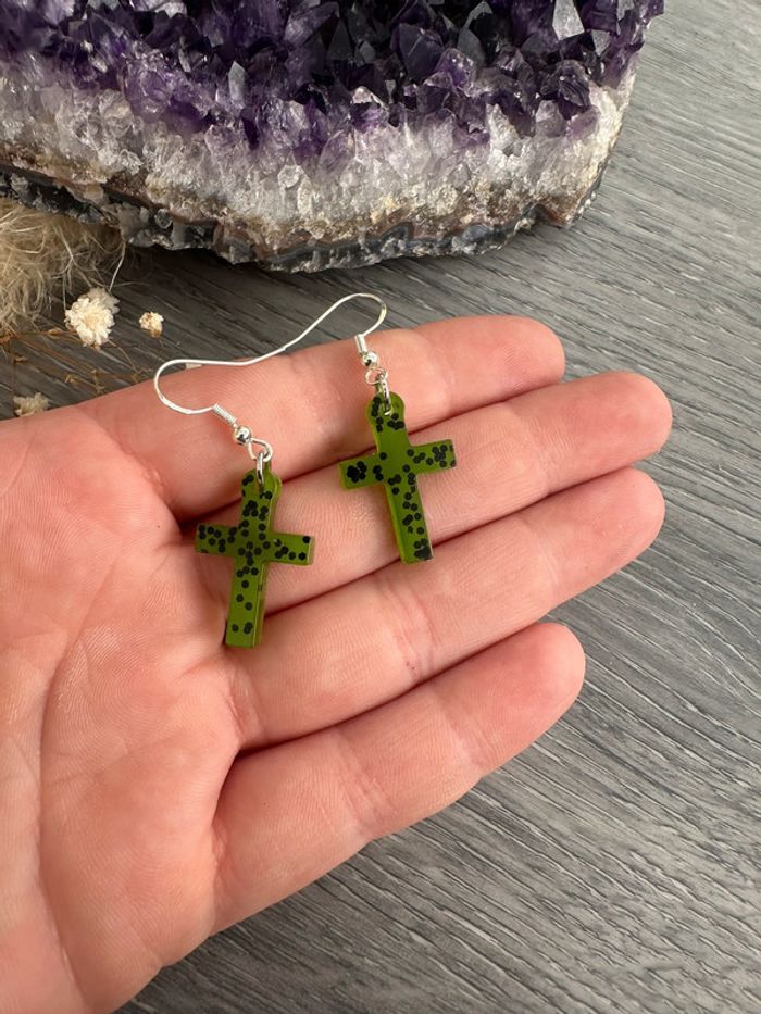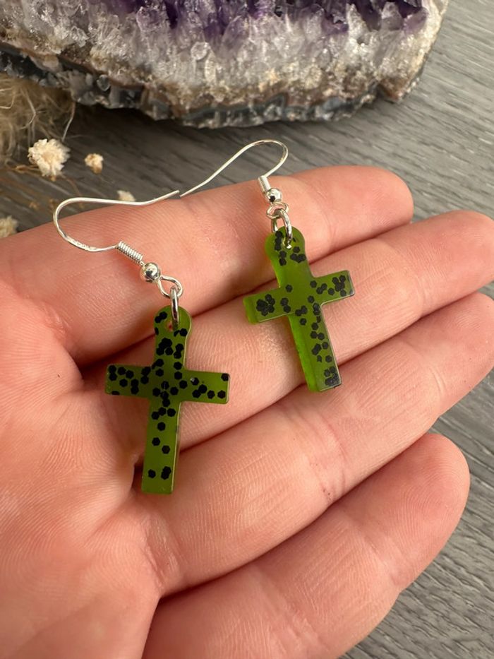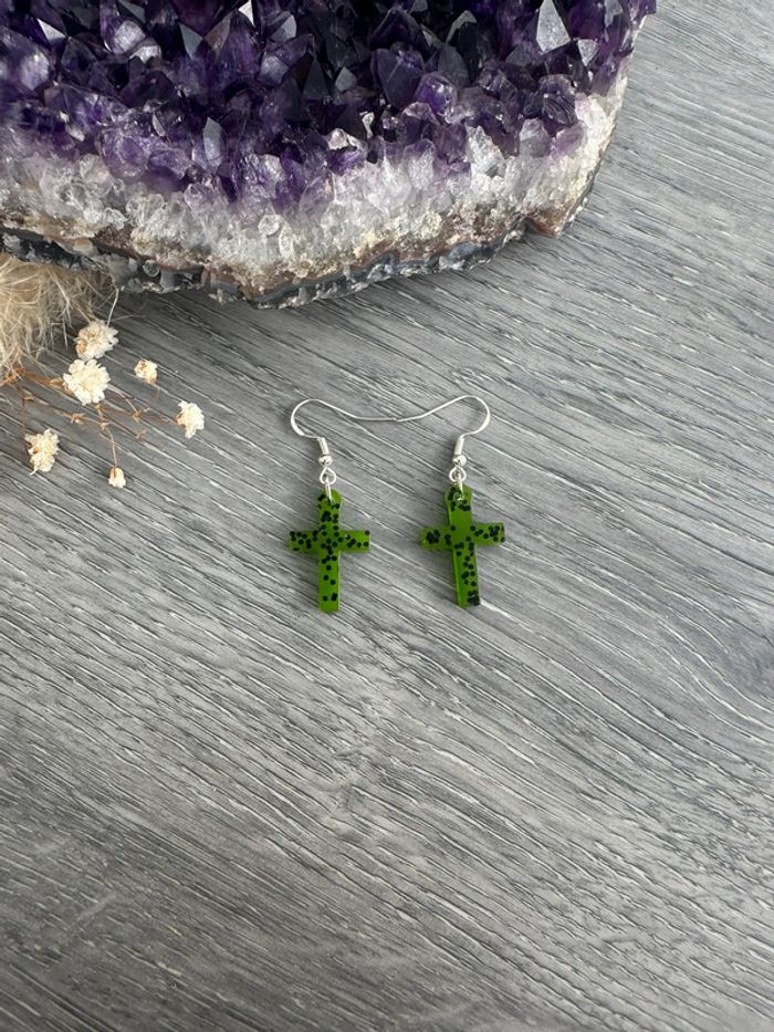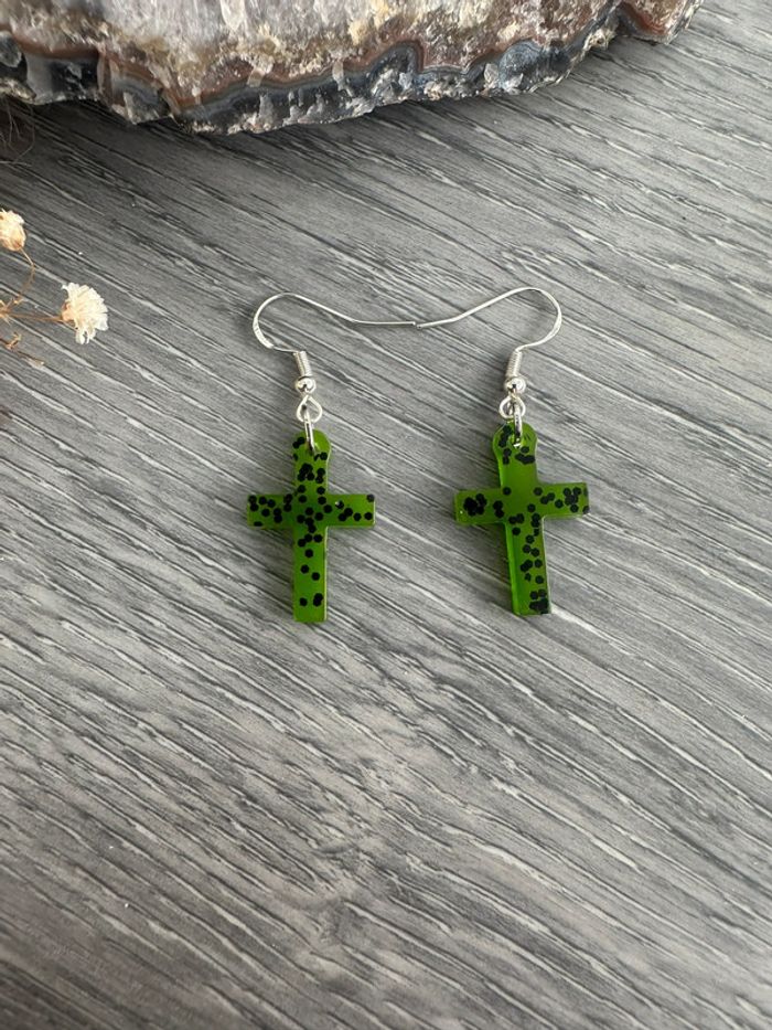 Boucles d'oreilles croix verte et paillettes noires - photo numéro 1